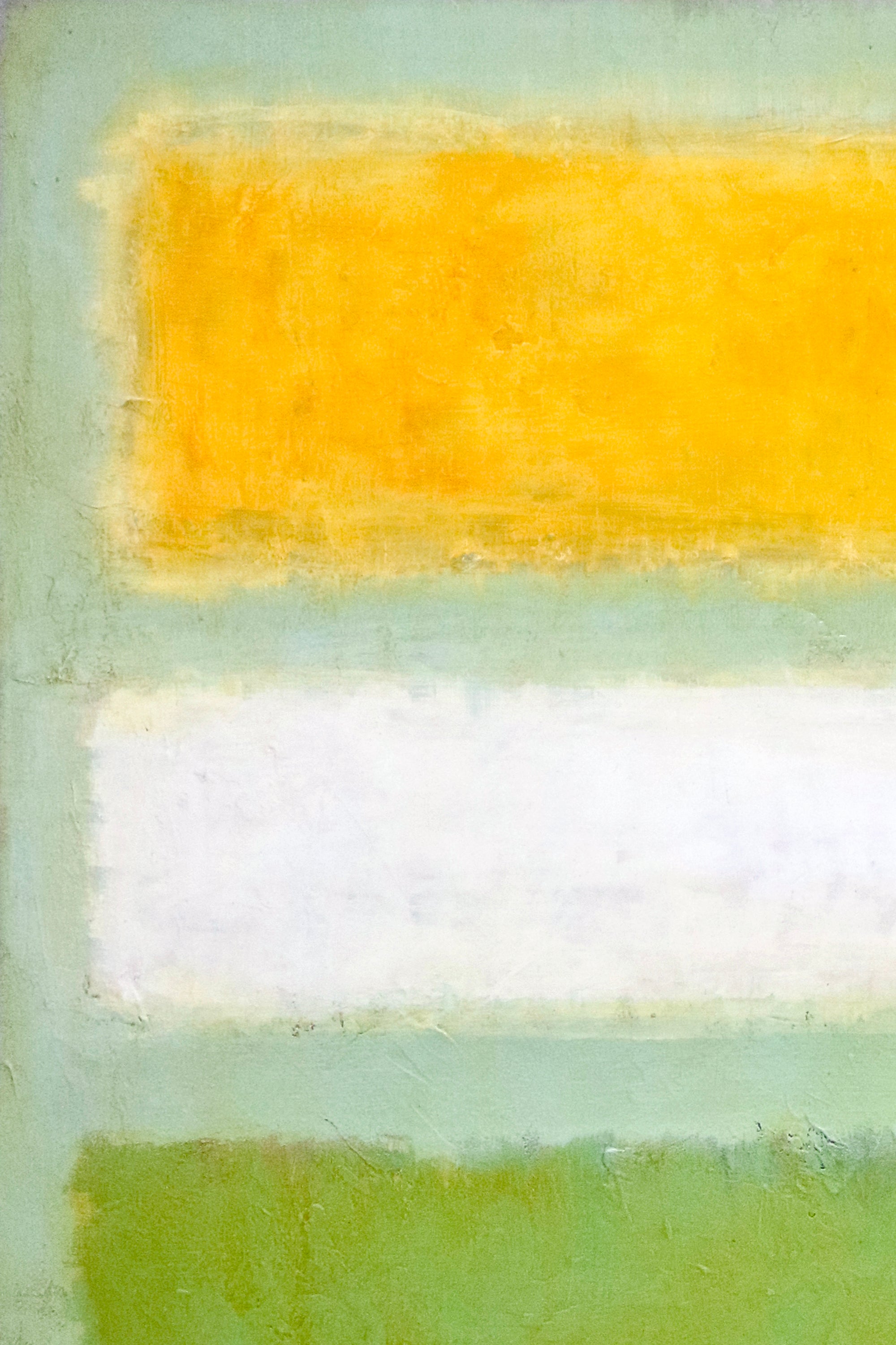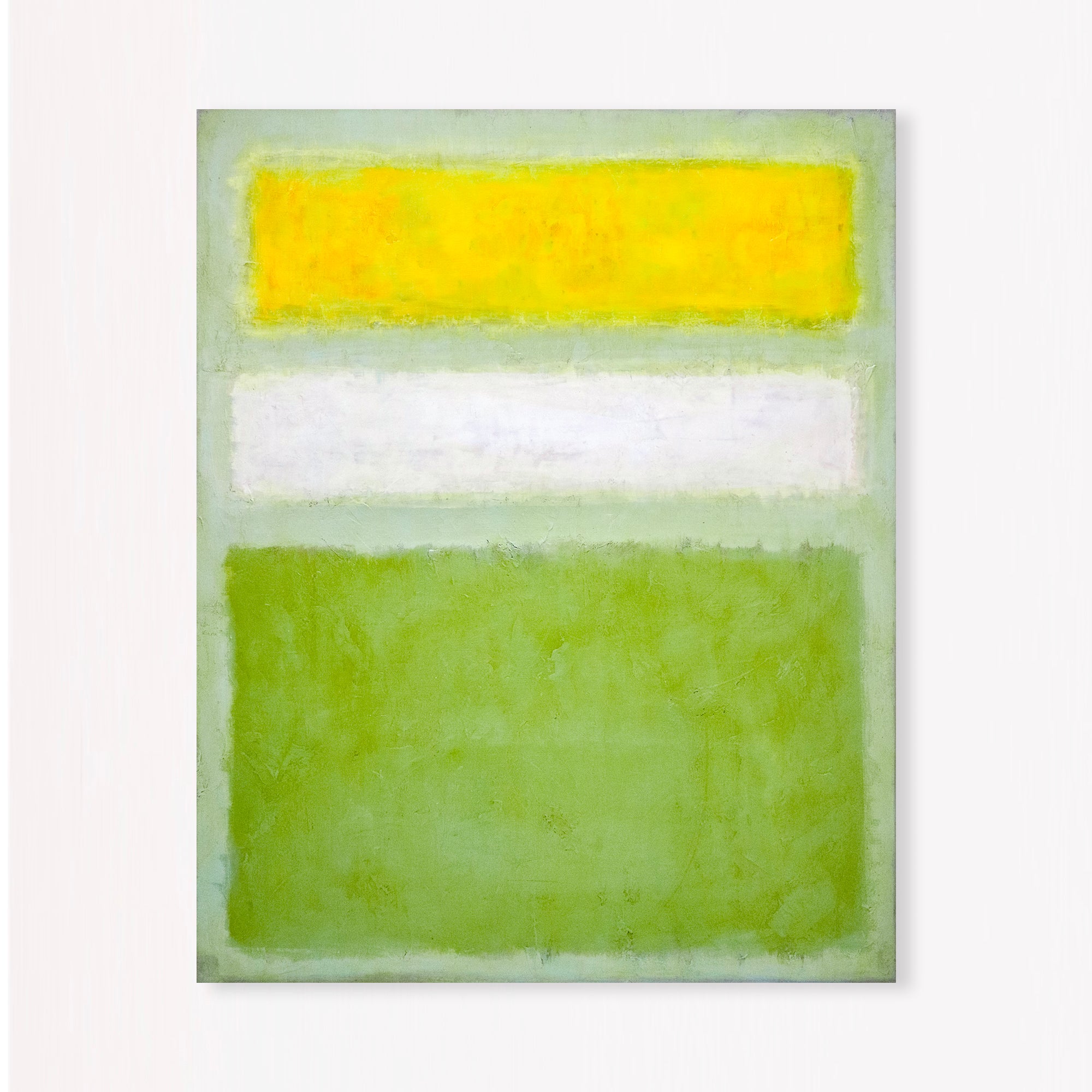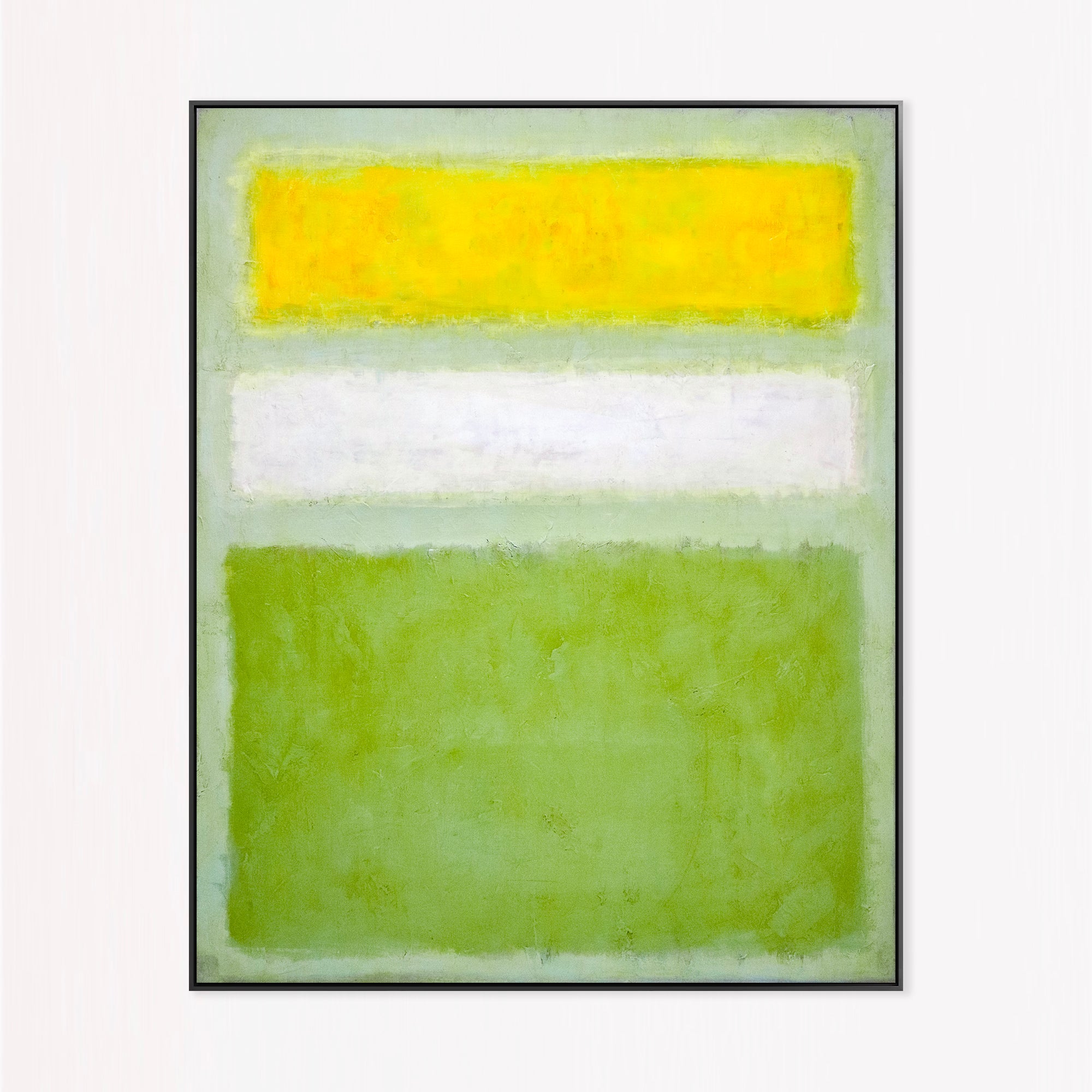 This abstract painting is an original painting and original art piece created with oil painting and acrylic painting on canvas. Meadow revisits the spirit of color-field abstraction while offering a gentler, more uplifting interpretation inspired by a spring landscape. Soft layers of yellow, green, olive, and white evoke an open hillside, clear sky, and wildflowers quietly unfolding in warmth and light.