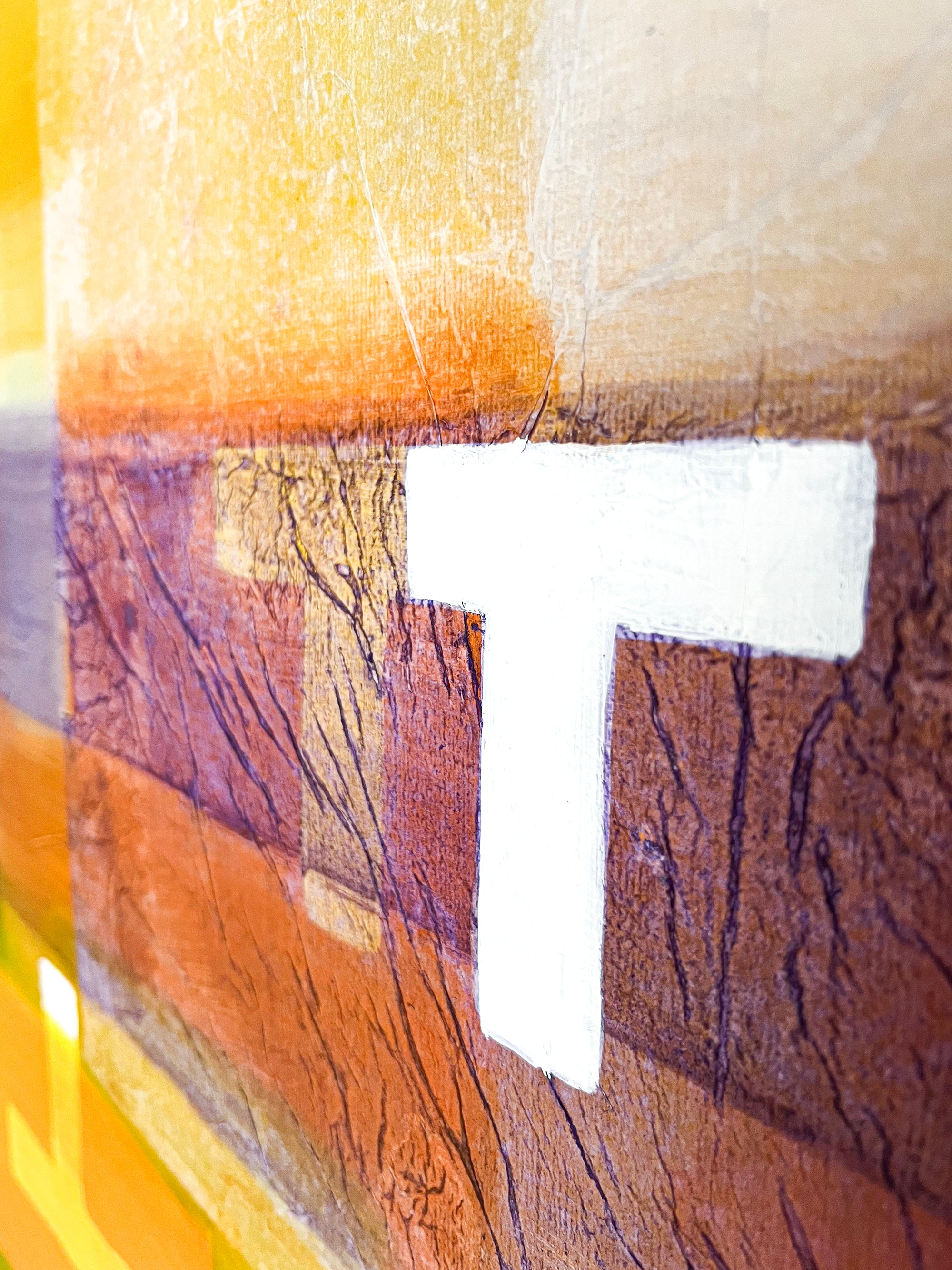 This abstract painting on canvas (40"x40" / 101x101cm) is a large modern wall art piece created with oil, acrylic, oil pastel, pencil, and delicate tissue paper. By incorporating Korean characters as visual symbols, this original painting merges language and image into a soft yet powerful abstraction, radiating warmth and quiet brightness.