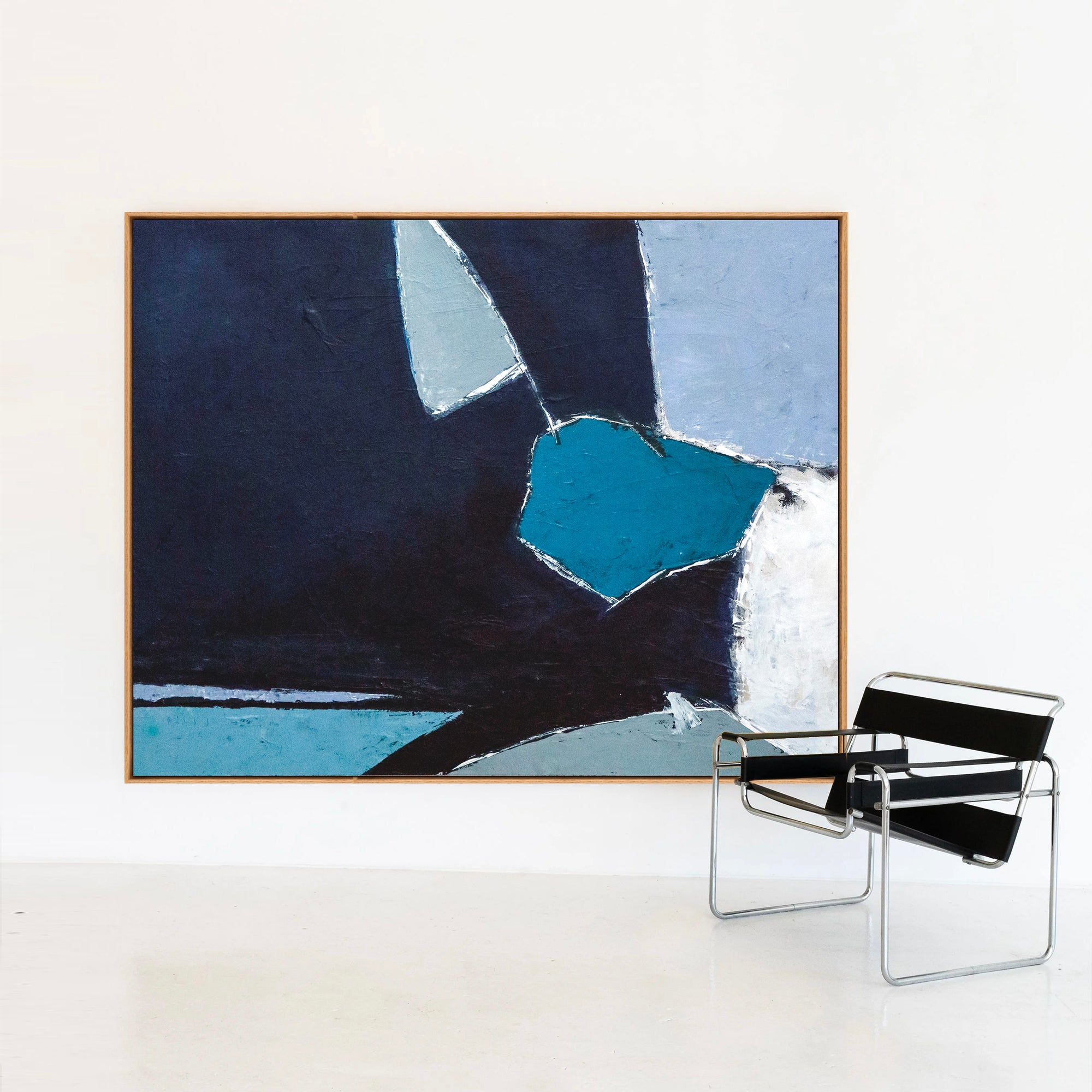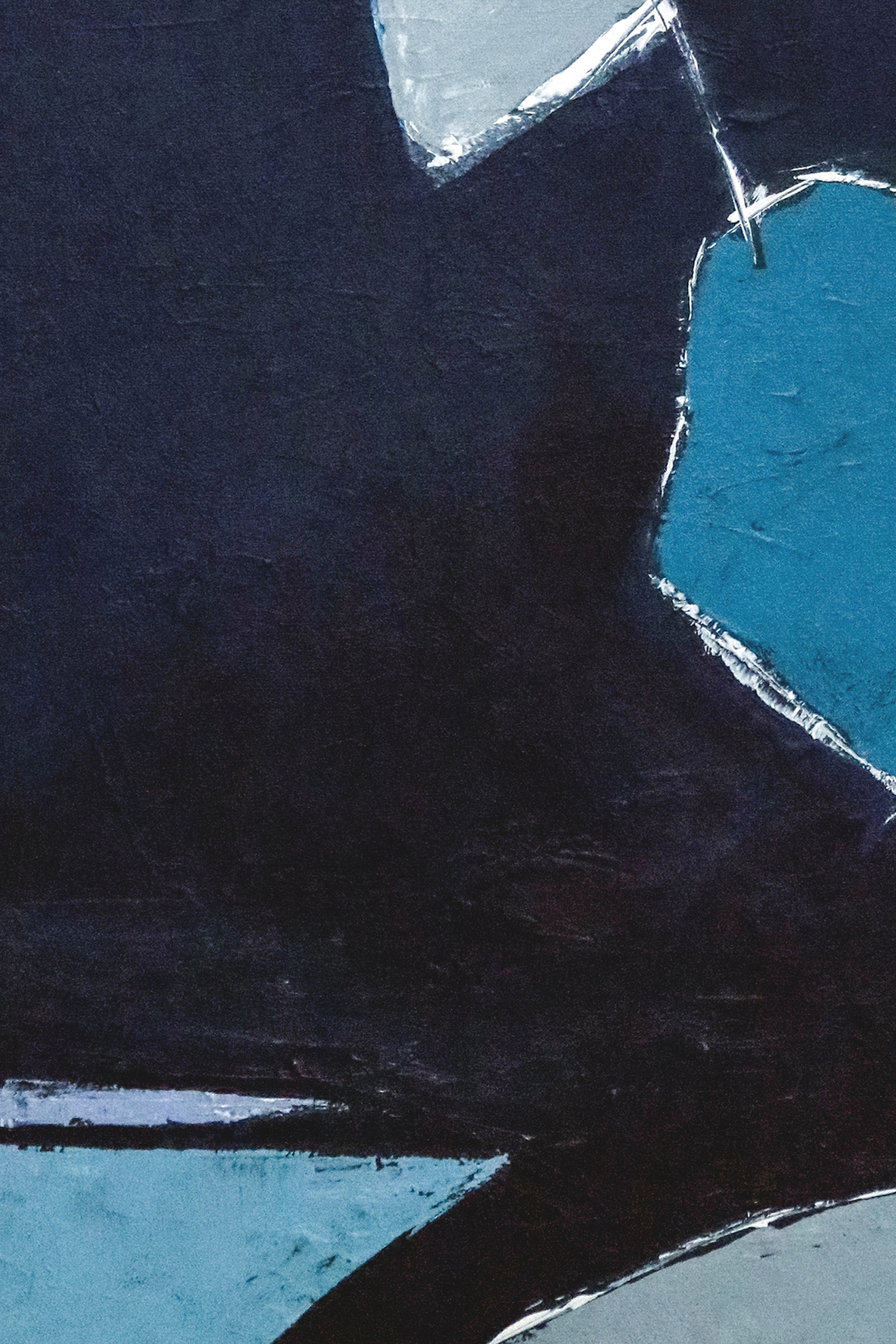This abstract painting is an original painting and original art piece created with oil painting and acrylic painting on canvas. Come Out to Play is a contemporary abstract work centered on the expressive and emotional range of blue. Layered shades of navy, concrete blue, and sky blue unfold across the surface, creating a calm yet gently energetic visual rhythm.