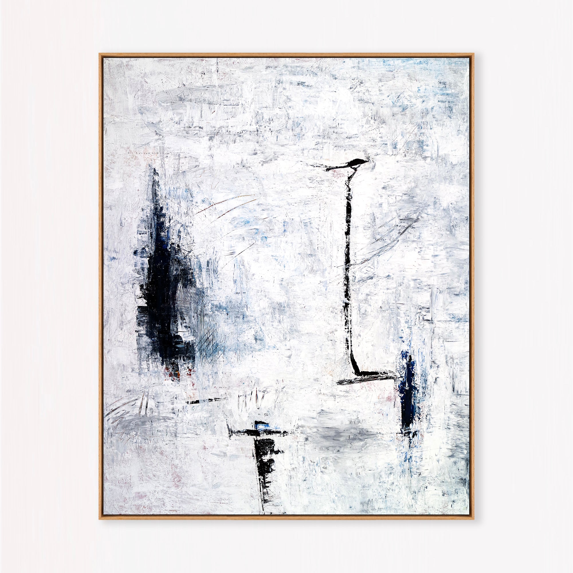 “Trace” explores the fleeting marks we leave behind — a meditation on impermanence articulated through minimal forms and atmospheric nuance. Soft black and white fields interact with subtle touches of deep blue, revealing delicate transitions that echo the passing of time. Each stroke feels intentional yet ephemeral, inviting viewers into a quiet dialogue about memory, presence, and disappearance. Calm, thoughtful, and evocative, this work embodies the expressive power of minimal abstraction, bringing depth and introspective beauty to any modern interior.