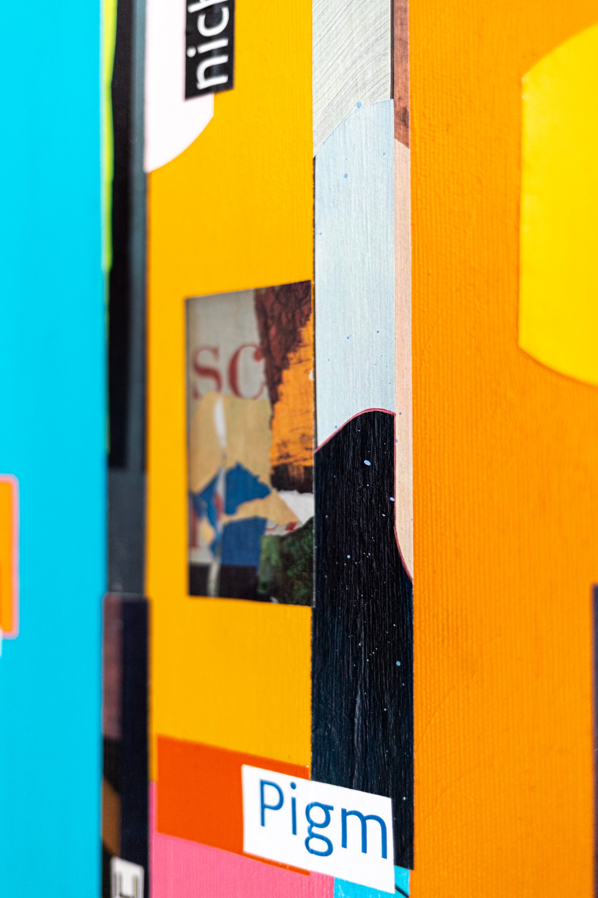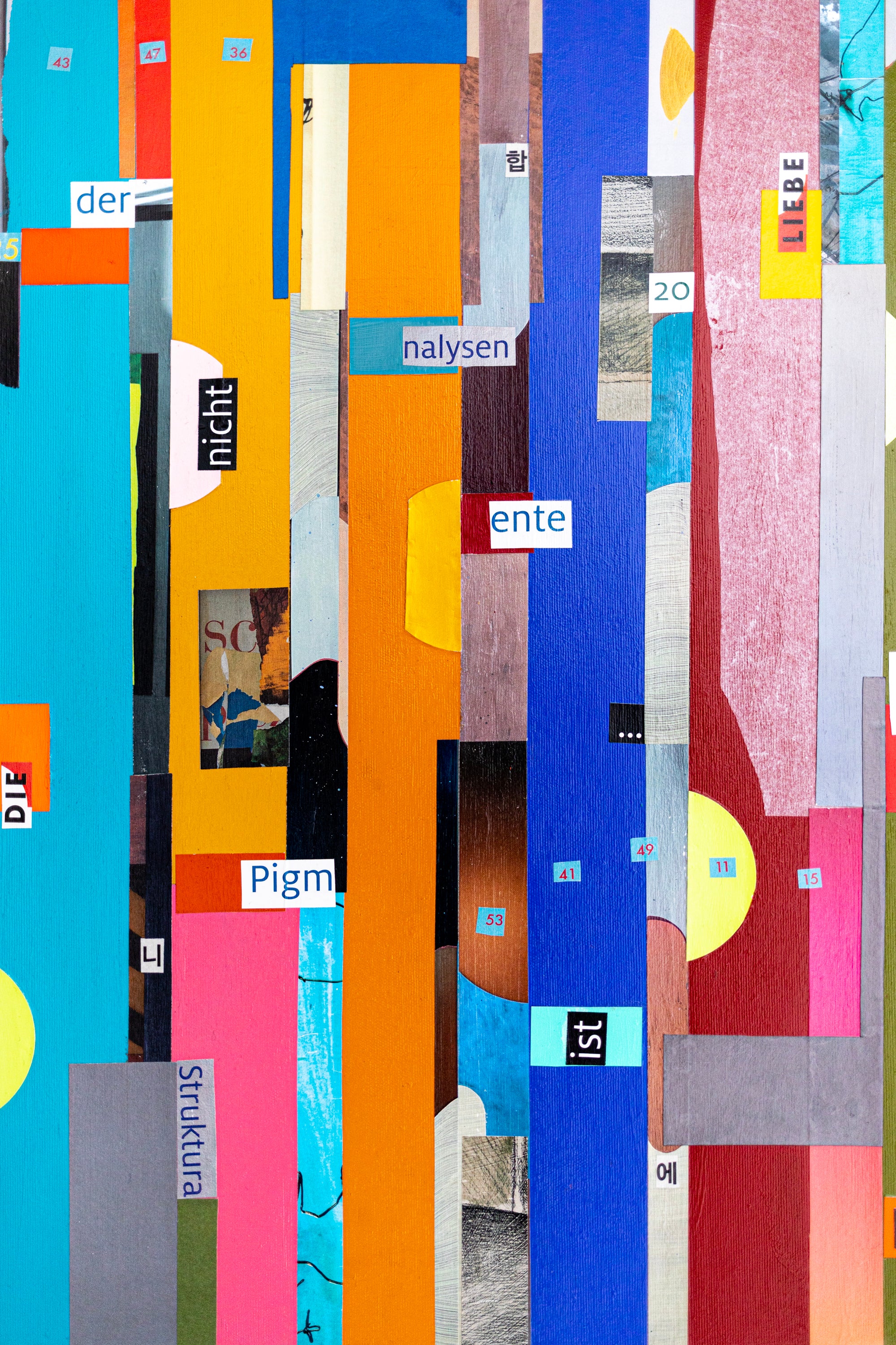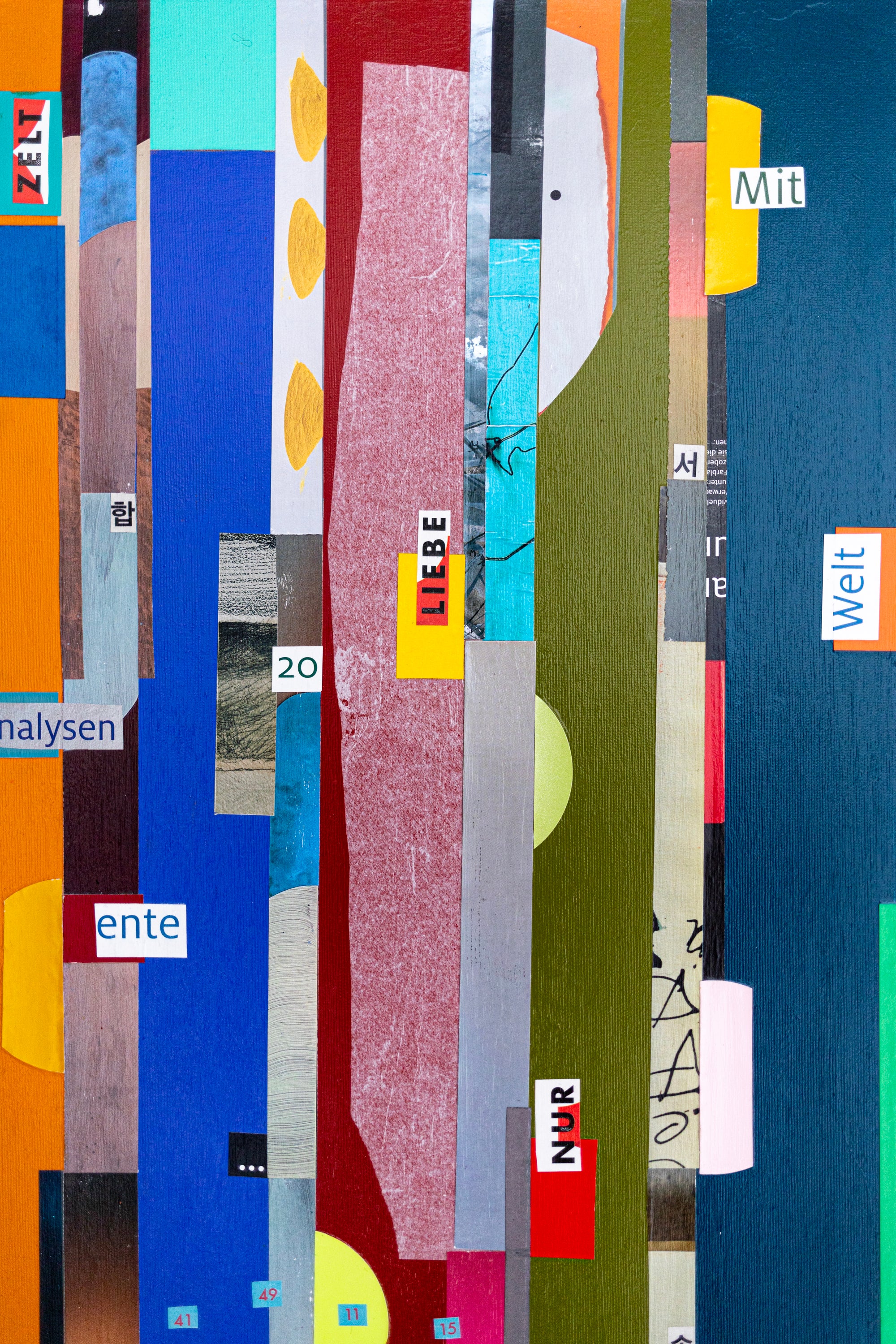 This abstract painting on canvas (30"x30" / 76x76cm) is a modern wall art piece created with acrylic painting, oil pastel, pencil, and mixed media. The geometric collage composition features bold vertical lines, half-moon shapes, and layered textures, creating rhythm, balance, and depth.