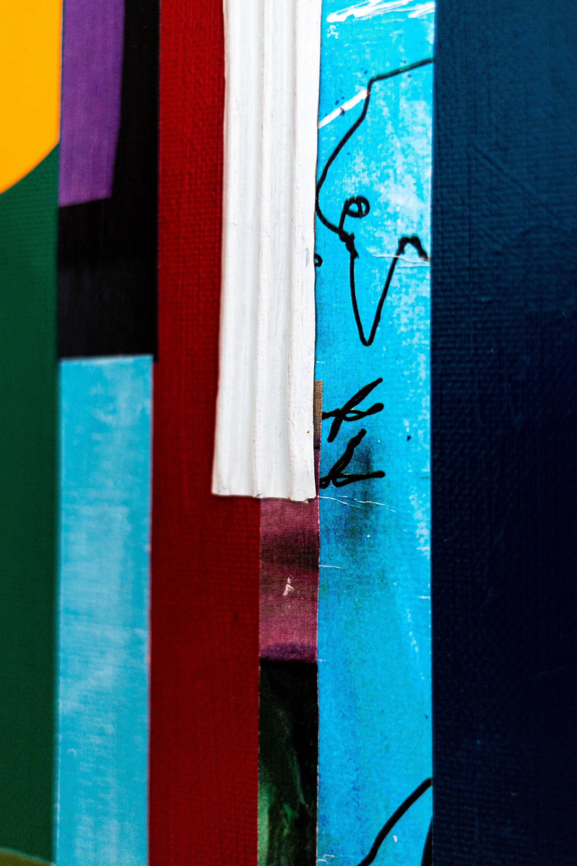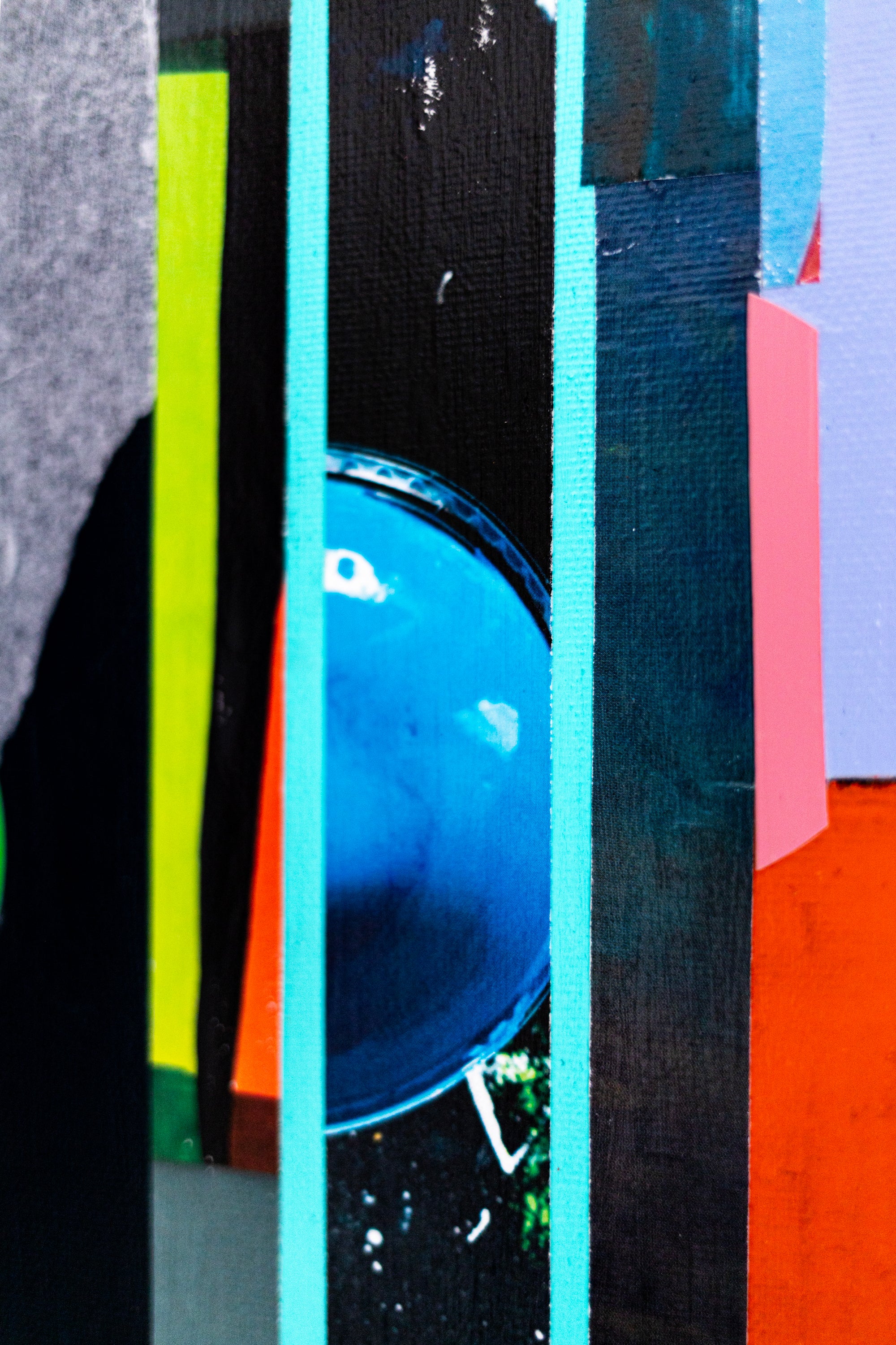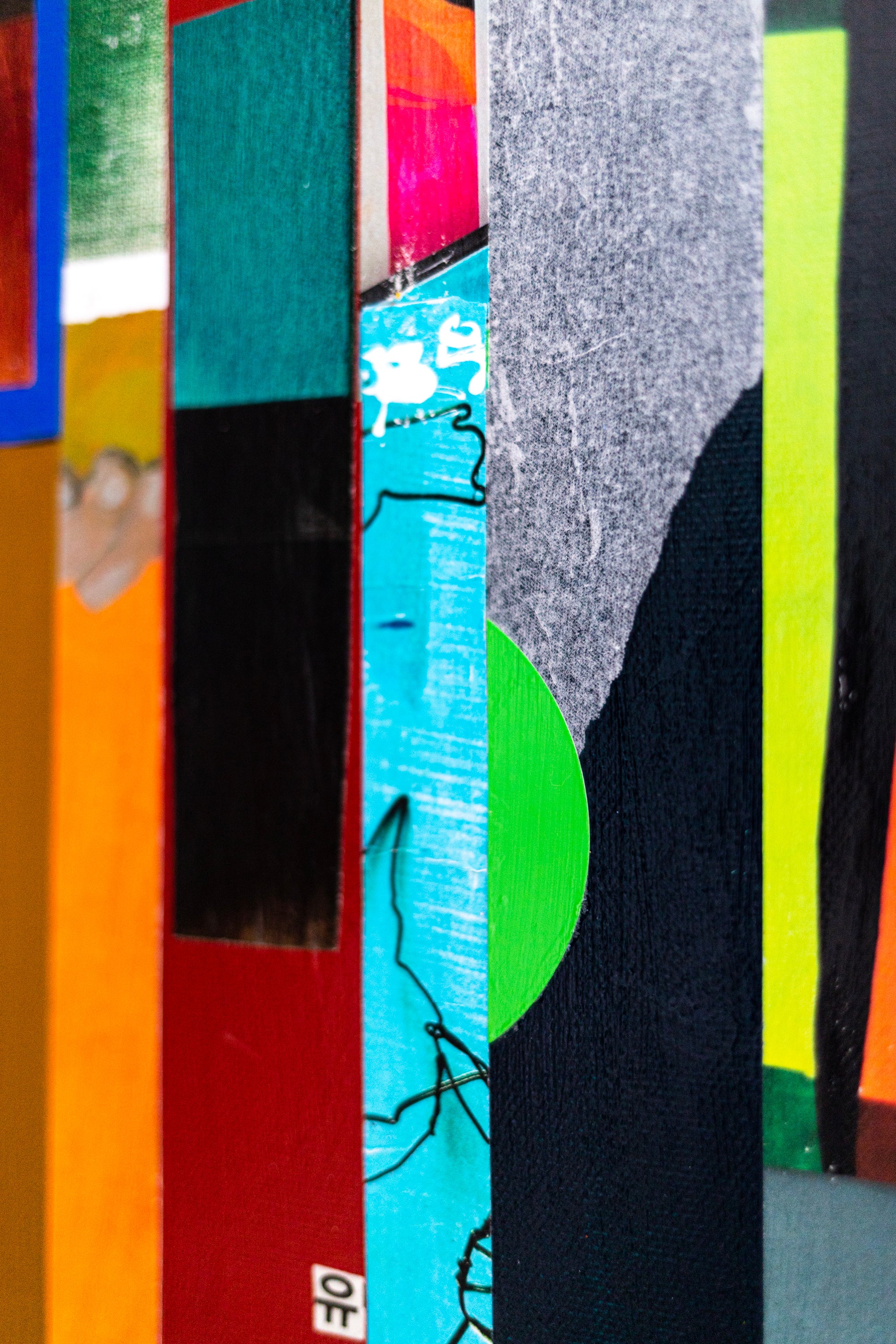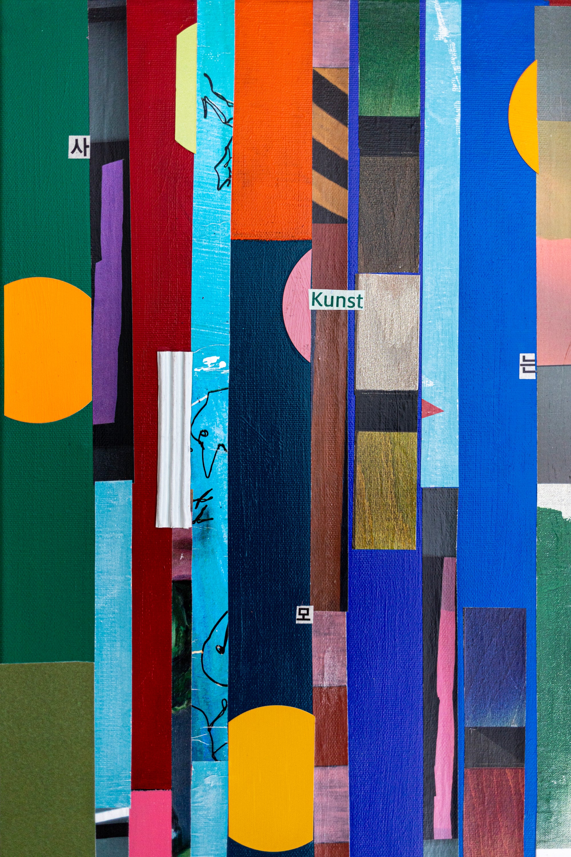 This abstract painting on canvas (28"x28" / 71x71cm) is a striking modern art wall art piece created with acrylic painting, oil pastel, pencil, and mixed media. This original painting presents refined abstract wall art through a geometric collage language, combining bold vertical lines, half-moon forms, and layered textures into a structured yet expressive composition. The surface builds rhythm through repetition and interruption, allowing shape and texture to guide the viewer’s eye across the painting. Strong contrasts and carefully placed elements create a sense of depth while maintaining clean, contemporary clarity. The result is minimalist art with architectural energy—balanced, modern, and sophisticated.