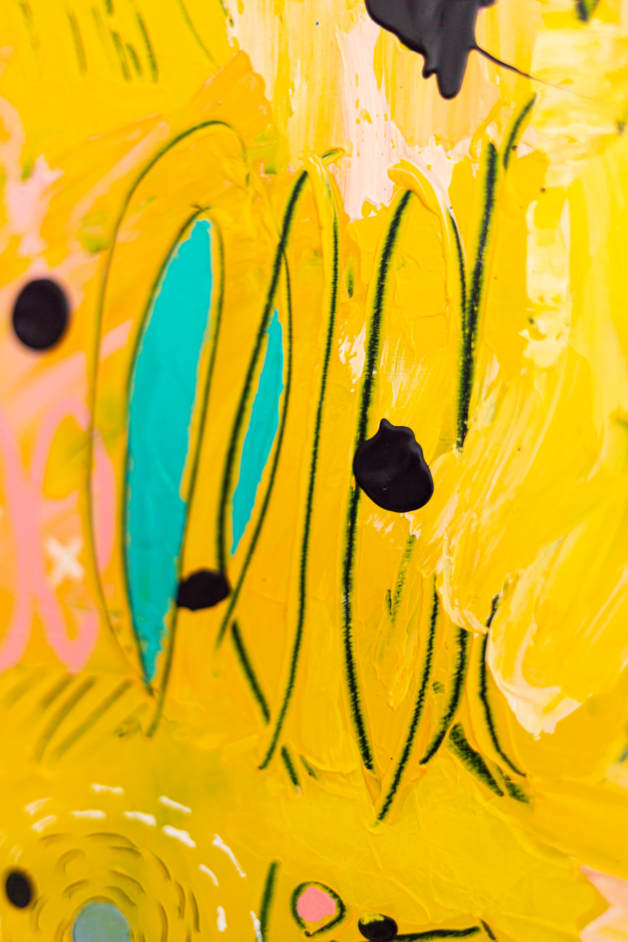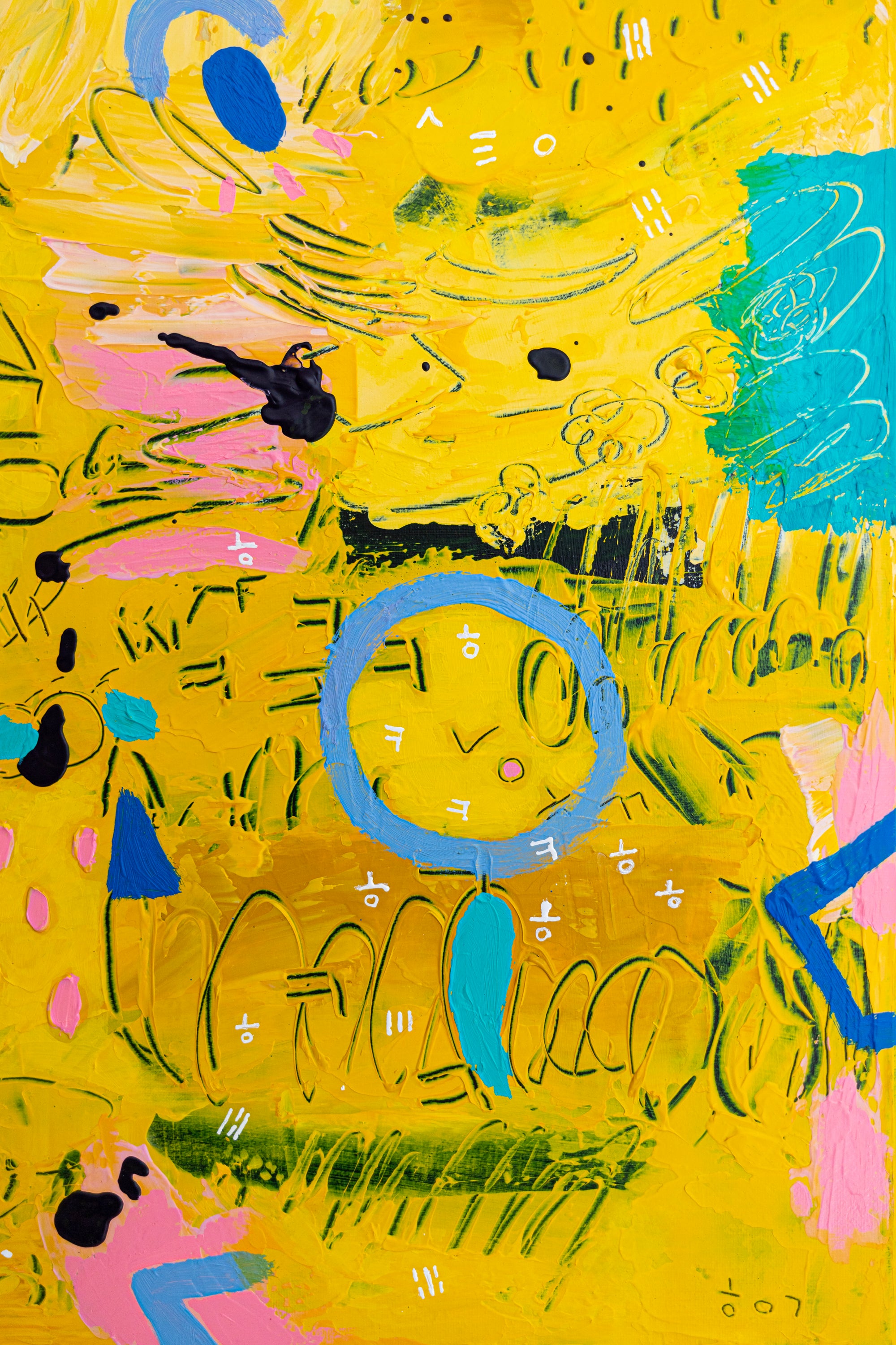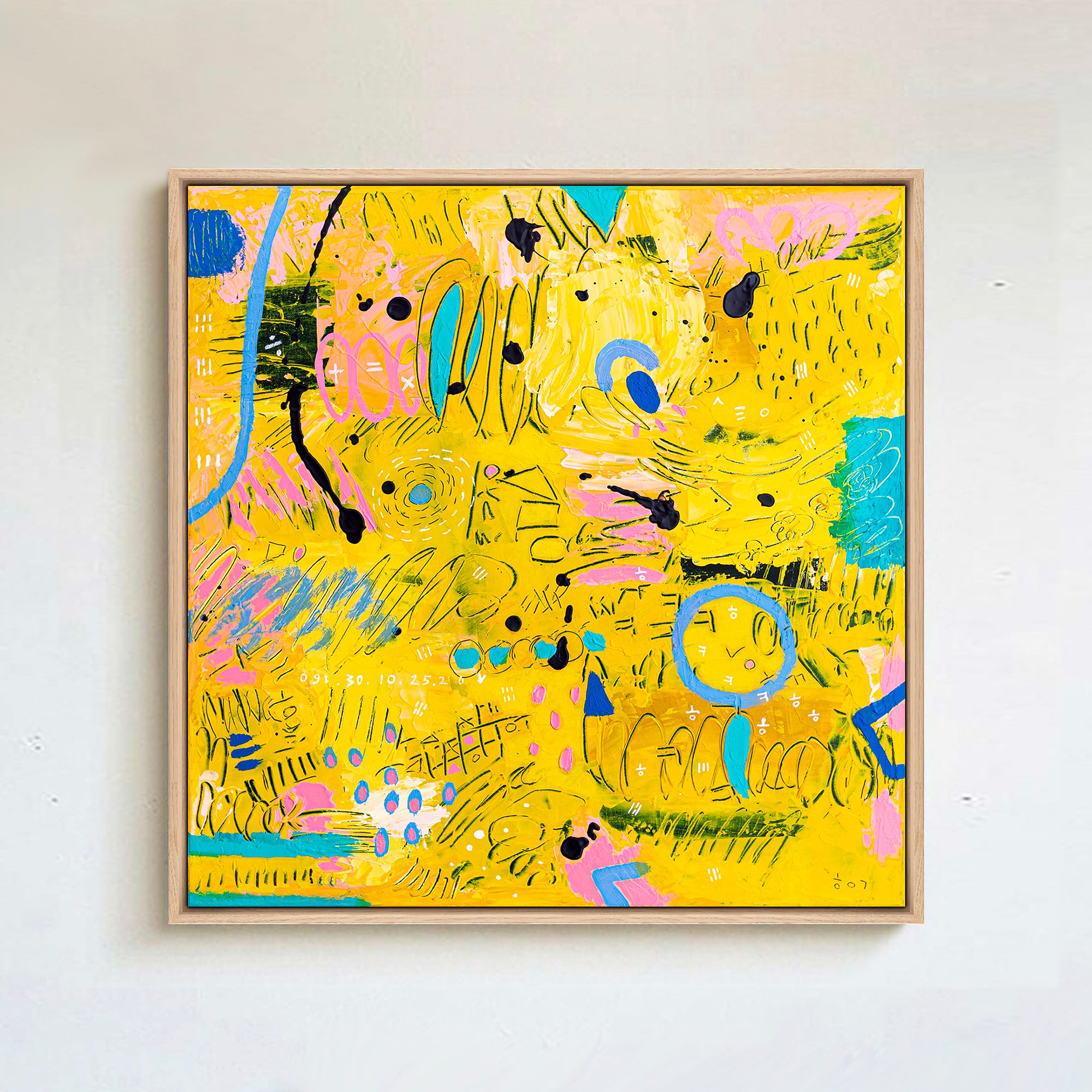 “Flavus clamans” was hand-painted in October 2025 and framed in an oak floater frame (overall 21"x21" / 53x53cm, depth 1.5" / 3cm). The composition combines luminous yellow and soft pink tones, accented with delicate details that bring rhythm and playfulness to the surface. Layered textures add movement and depth, creating a painting full of energy and modern sophistication. One-of-a-kind artwork, signed on both the front and back and accompanied by a certificate of authenticity, this original art piece brings warmth and contemporary charm to living rooms, studios, or gallery spaces.