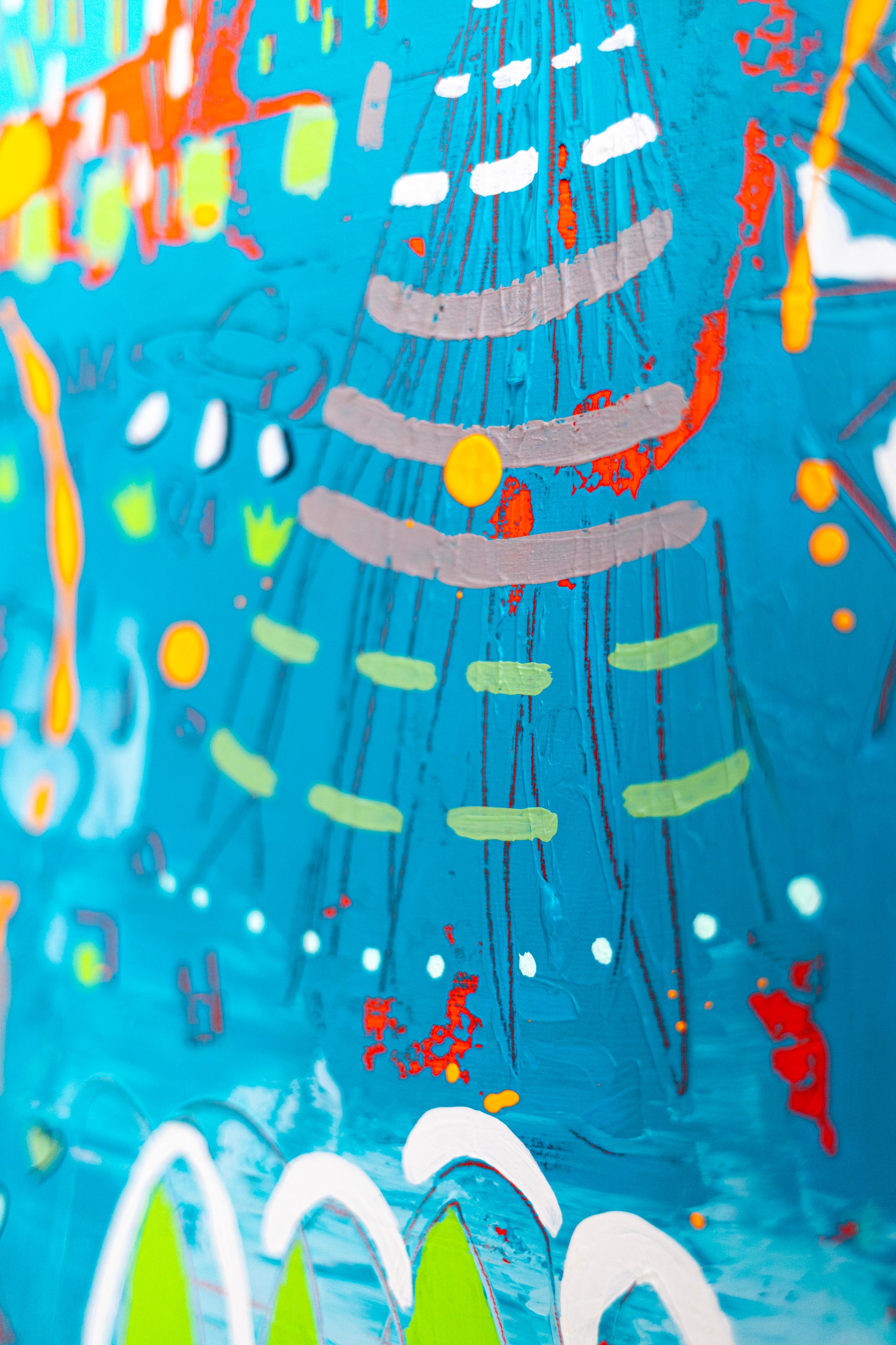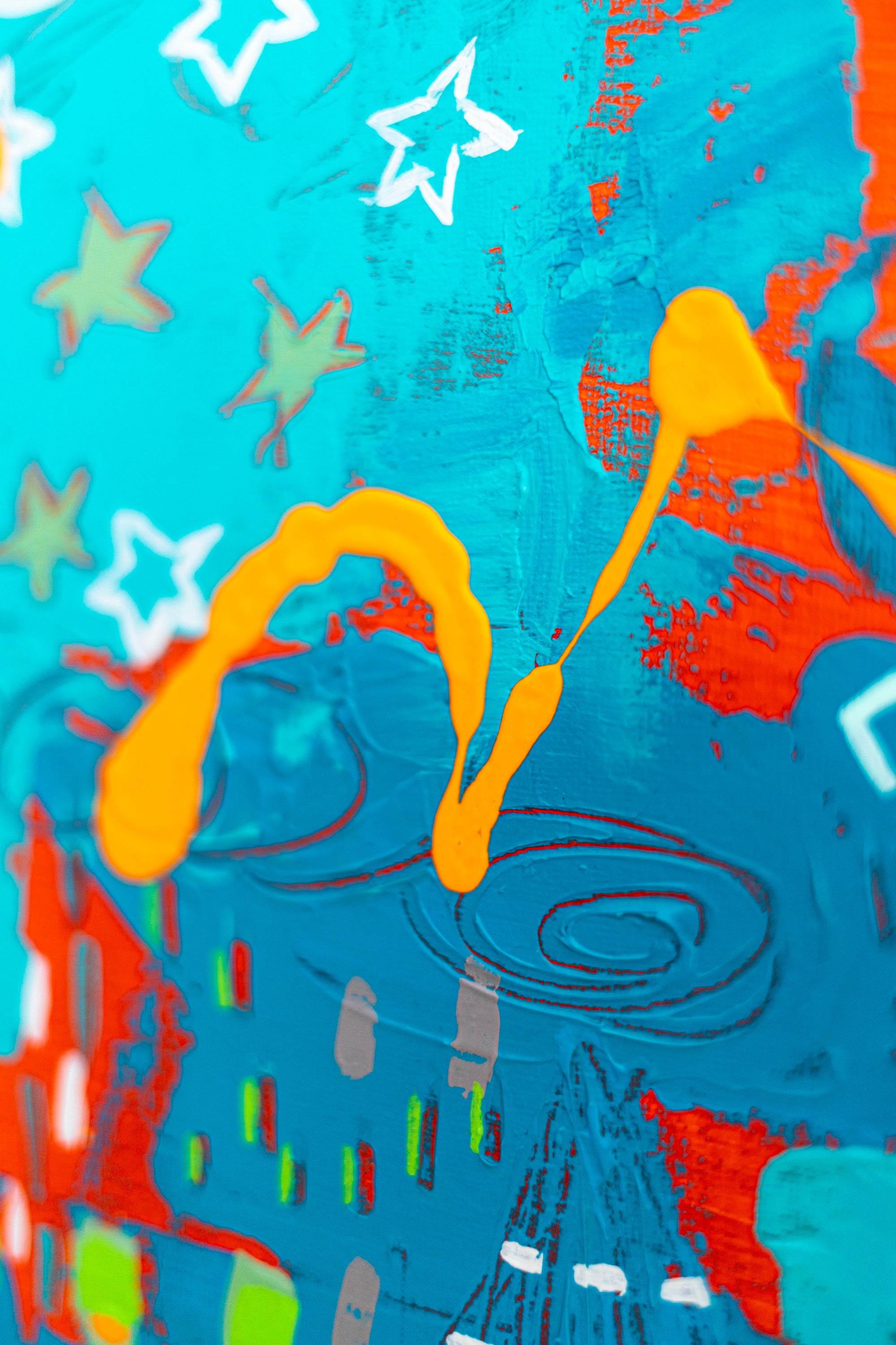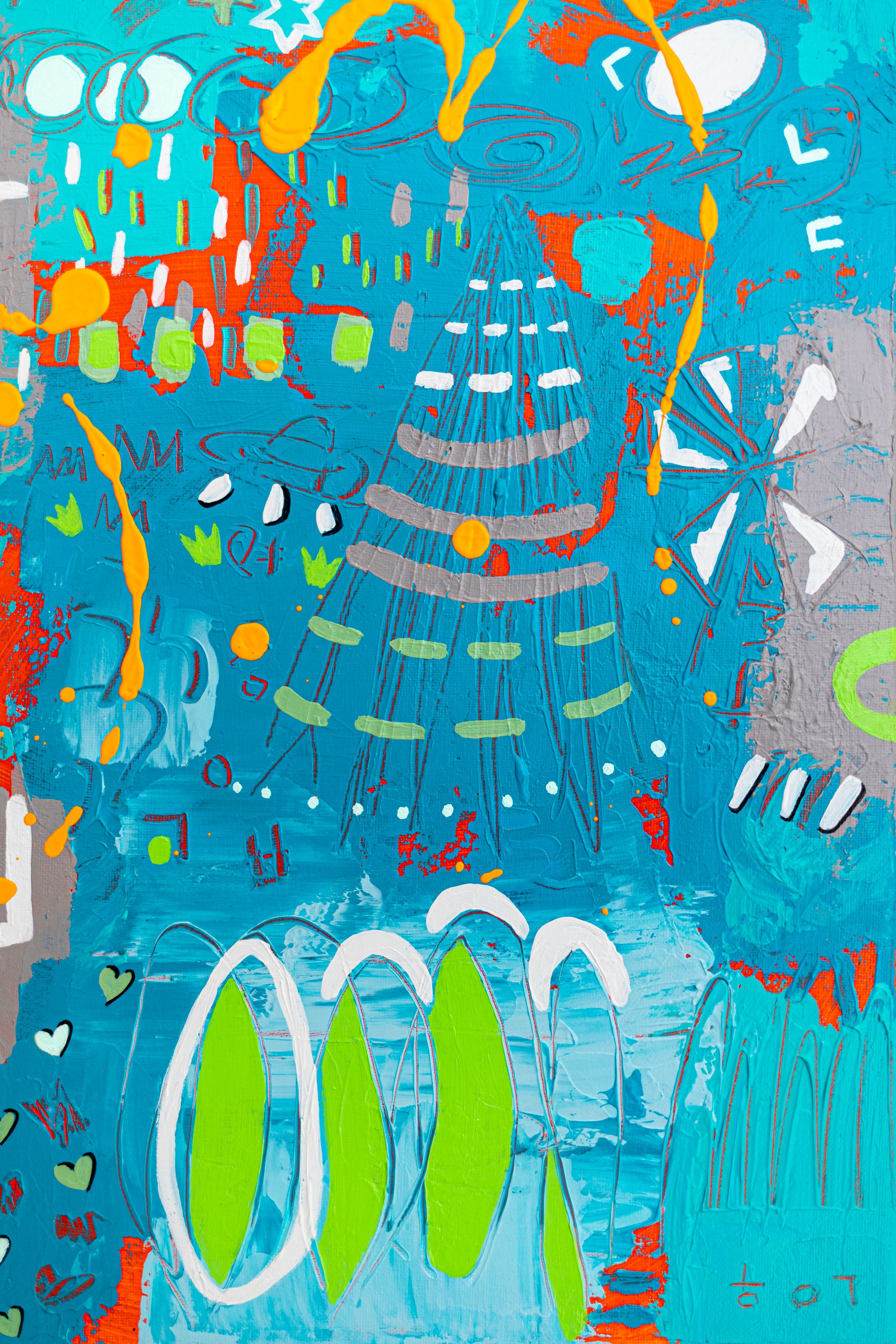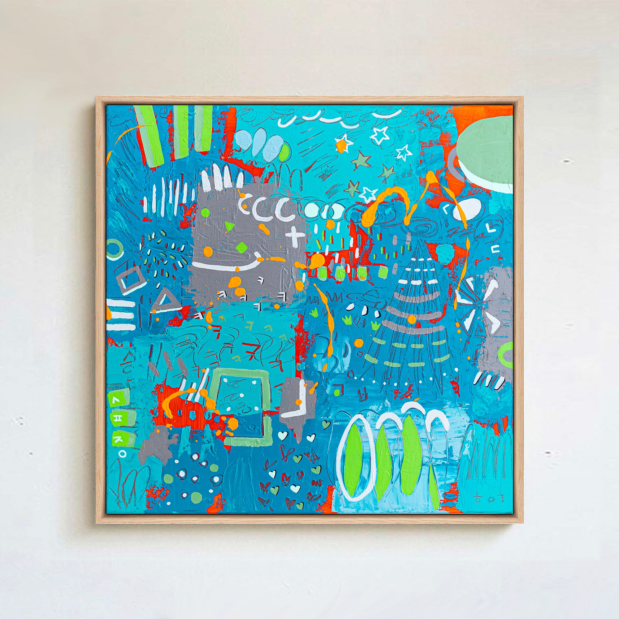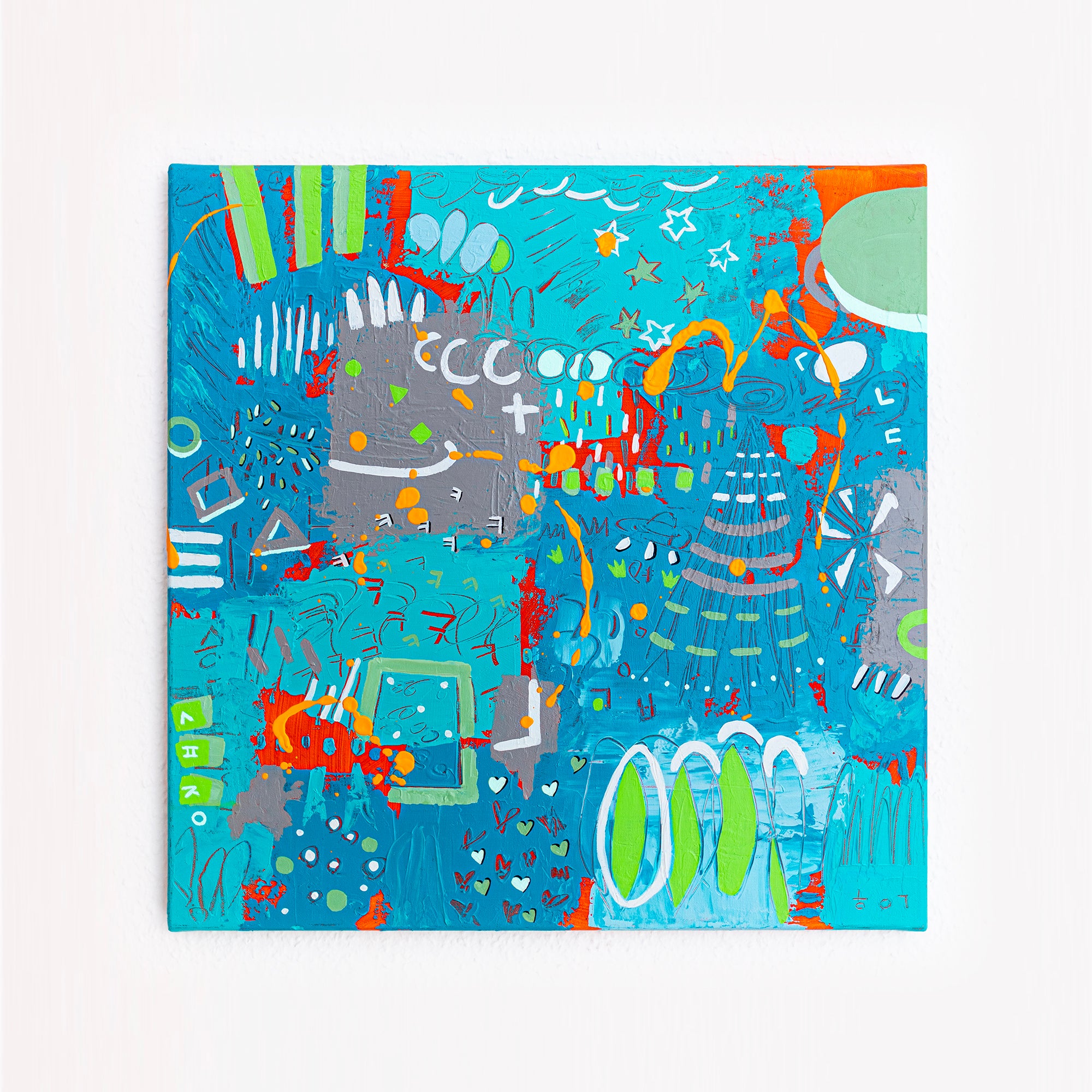 “Minus ita I” was hand-painted in October 2025 and framed in an oak floater frame (overall 21"x21" / 53x53cm, depth 1.5" / 3cm). A dynamic composition of bright turquoise and orange tones is accented with small, intricate details, creating a lively and colorful surface full of rhythm and energy. The layered treatment enhances movement and texture, giving the painting a sense of depth and vibrancy. One-of-a-kind artwork, signed on both the front and back and accompanied by a certificate of authenticity, this original art piece adds a contemporary and sophisticated focal point to any space.