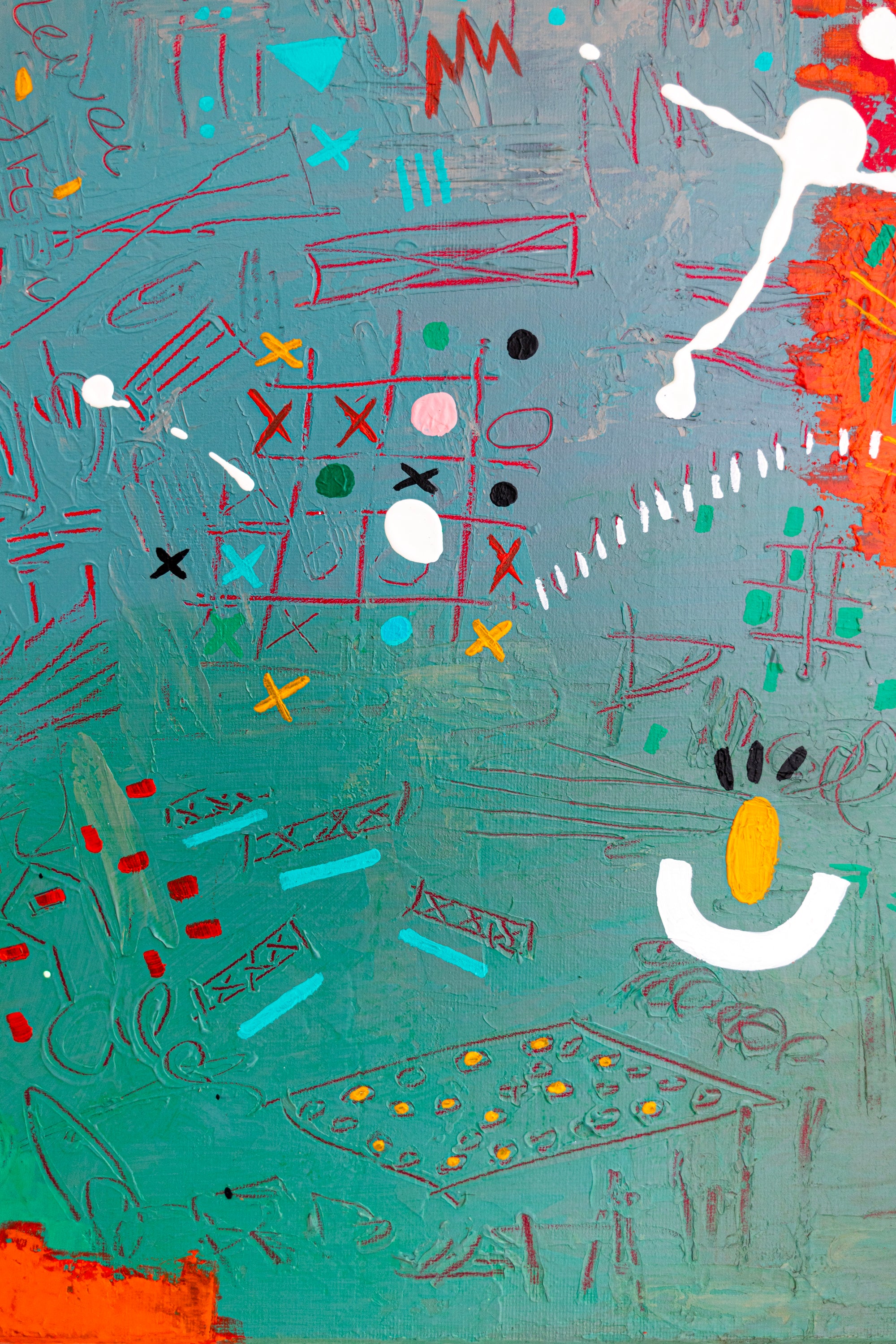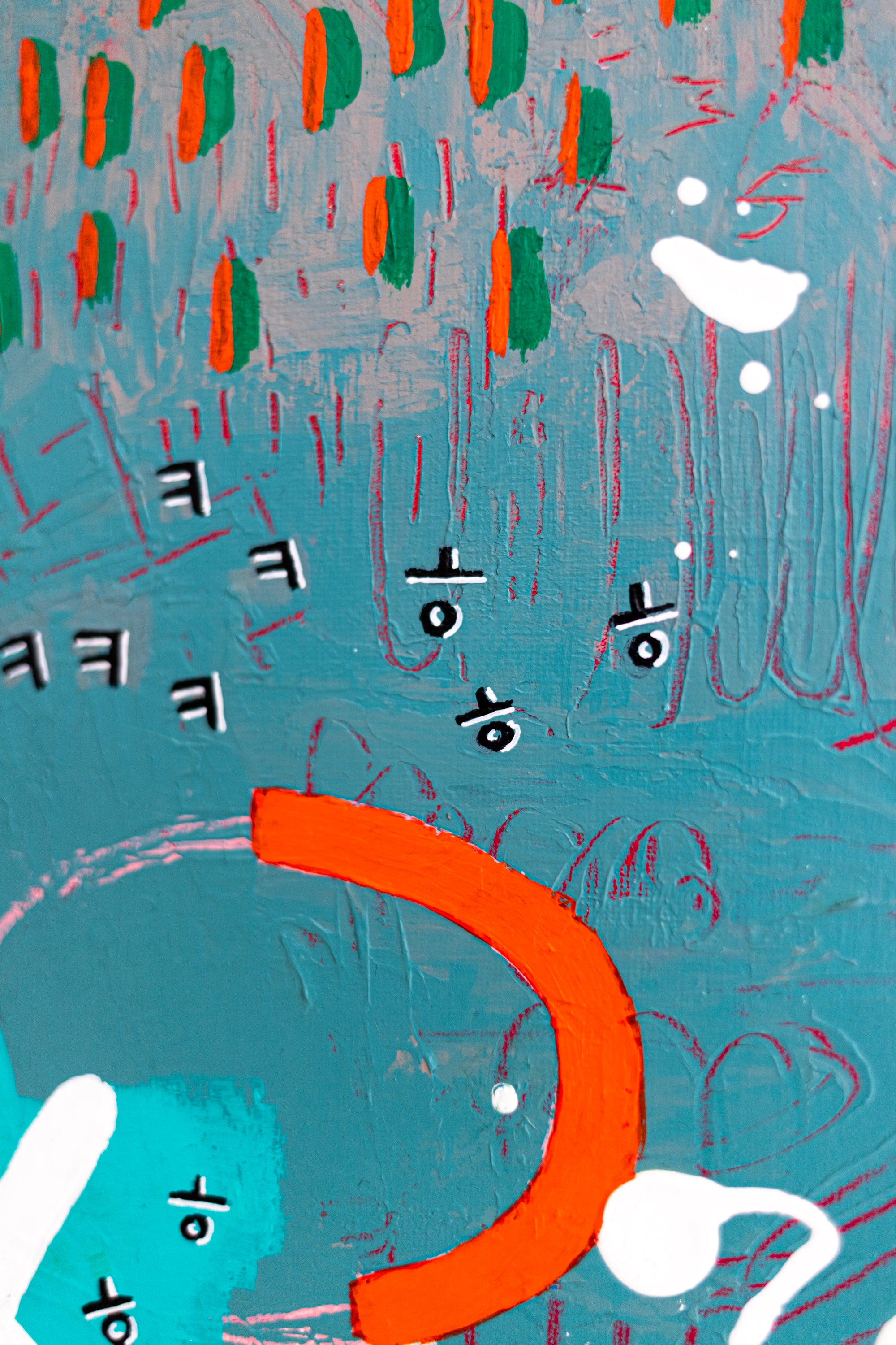 “Minus ita II” was hand-painted in October 2025 and framed in an oak floater frame (overall 21"x21" / 53x53cm, depth 1.5" / 3cm). A dynamic composition of bright turquoise and orange tones is accented with small, intricate details, creating a lively and colorful surface full of rhythm and energy. The layered treatment enhances movement and texture, giving the painting a sense of depth and vibrancy. One-of-a-kind artwork, signed on both the front and back and accompanied by a certificate of authenticity, this original art piece adds a contemporary and sophisticated focal point to any space.