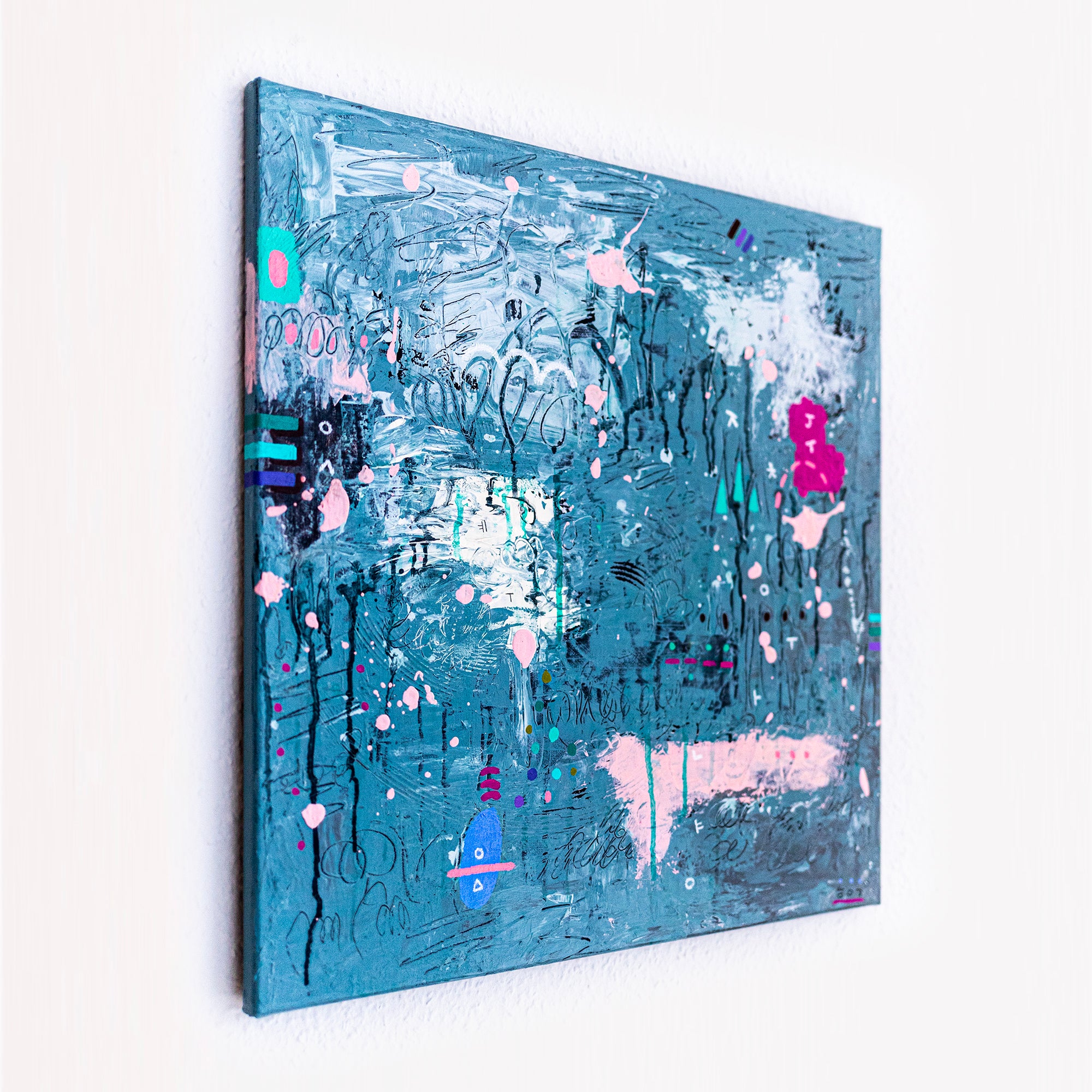 This abstract painting on canvas (20"x20" / 50x50cm) is a modern wall art piece created with acrylic painting, oil pastel, pencil, and mixed media. This original painting represents refined abstract wall art, canvas art, and minimalist art, offering a strong contemporary presence through its layered surface and dynamic composition.