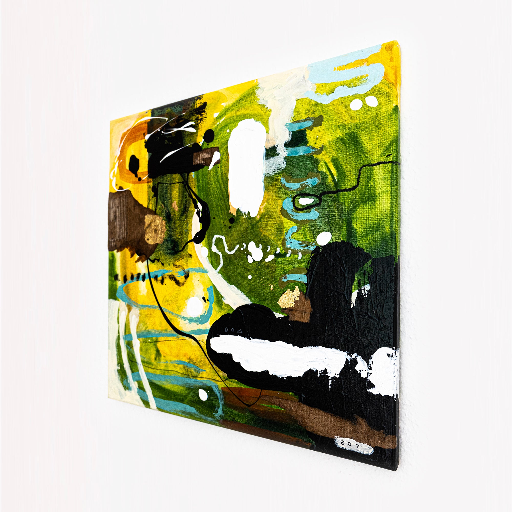 Abstract painting in green and yellow tones, 20"x20" (50x50cm), created with oil, acrylic, and mixed media on canvas – a bold and modern wall art piece, one-of-a-kind, signed, and ready to hang.