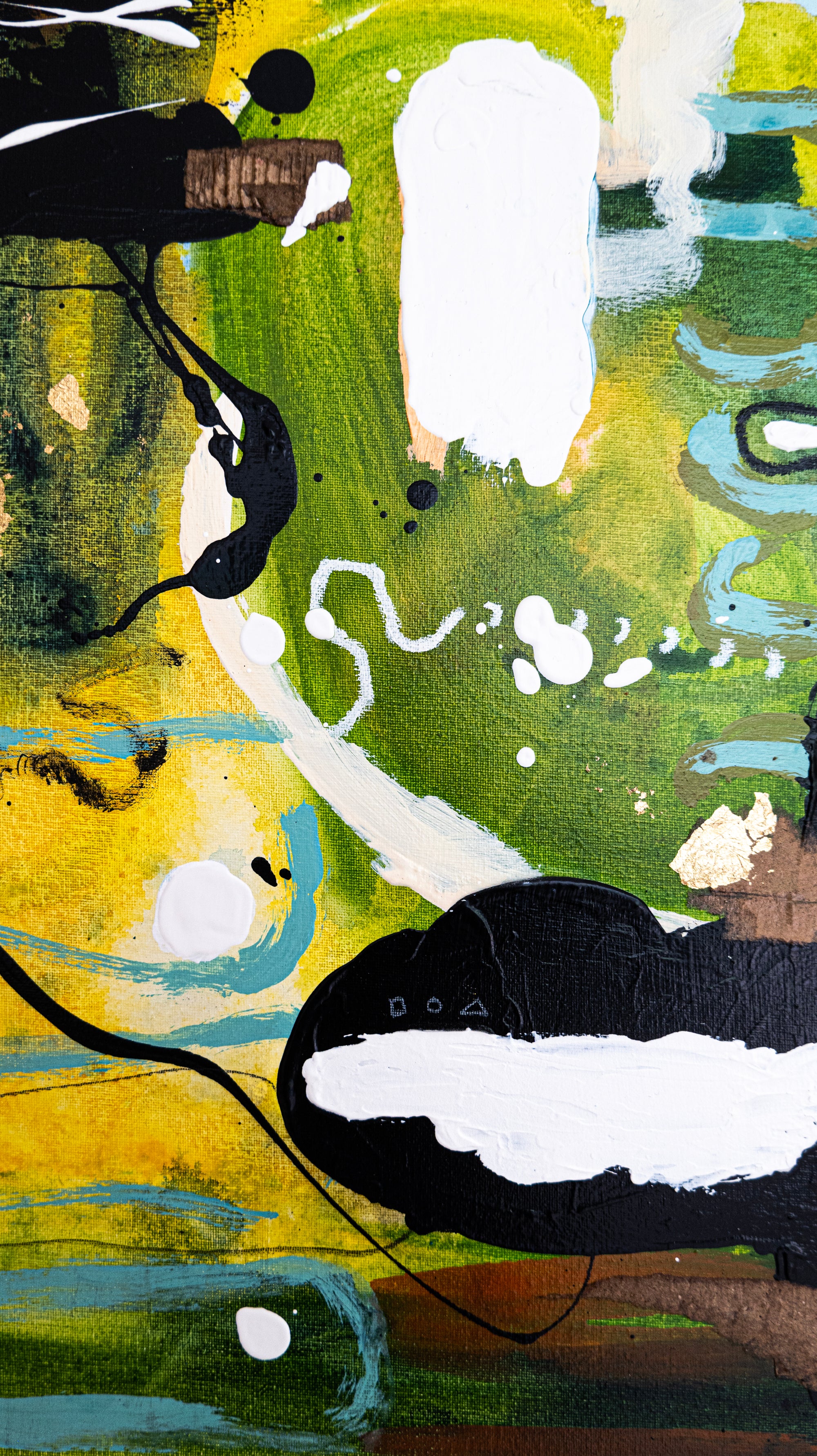 This expressive abstract artwork combines rich shades of green, yellow, black, white, and subtle hints of blue and brown. Its flowing organic movement contrasts with bold geometric energy, creating a vibrant and contemporary composition with striking visual rhythm. Layered brushwork and textures reveal depth and complexity, making the piece captivating from every angle. Each artwork is 100% hand-painted by Hyunah Kim, not a print or giclée, ensuring the originality and authenticity of the piece. Professionally framed in a natural oak floater frame, it’s signed on both front and back and includes a certificate of authenticity. A perfect statement piece for modern interiors, living spaces, offices, or gallery walls.