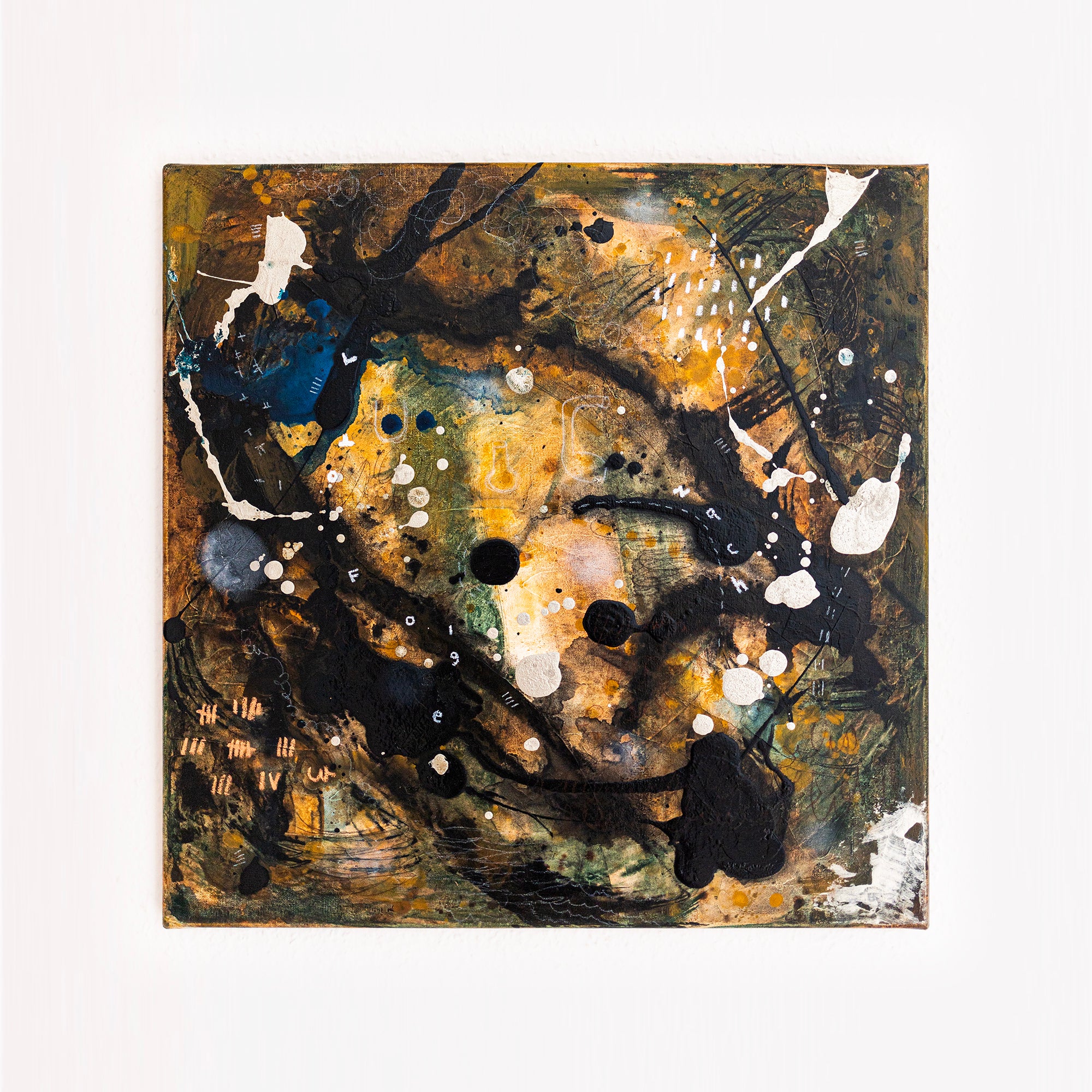 This abstract painting on canvas (20"x20" / 50x50cm) is a modern wall art piece created with acrylic, oil pastel, pencil, and mixed media. The layered surface and dynamic composition give this original painting a striking contemporary presence, making it an ideal centerpiece for modern homes, gallery walls, or office spaces.