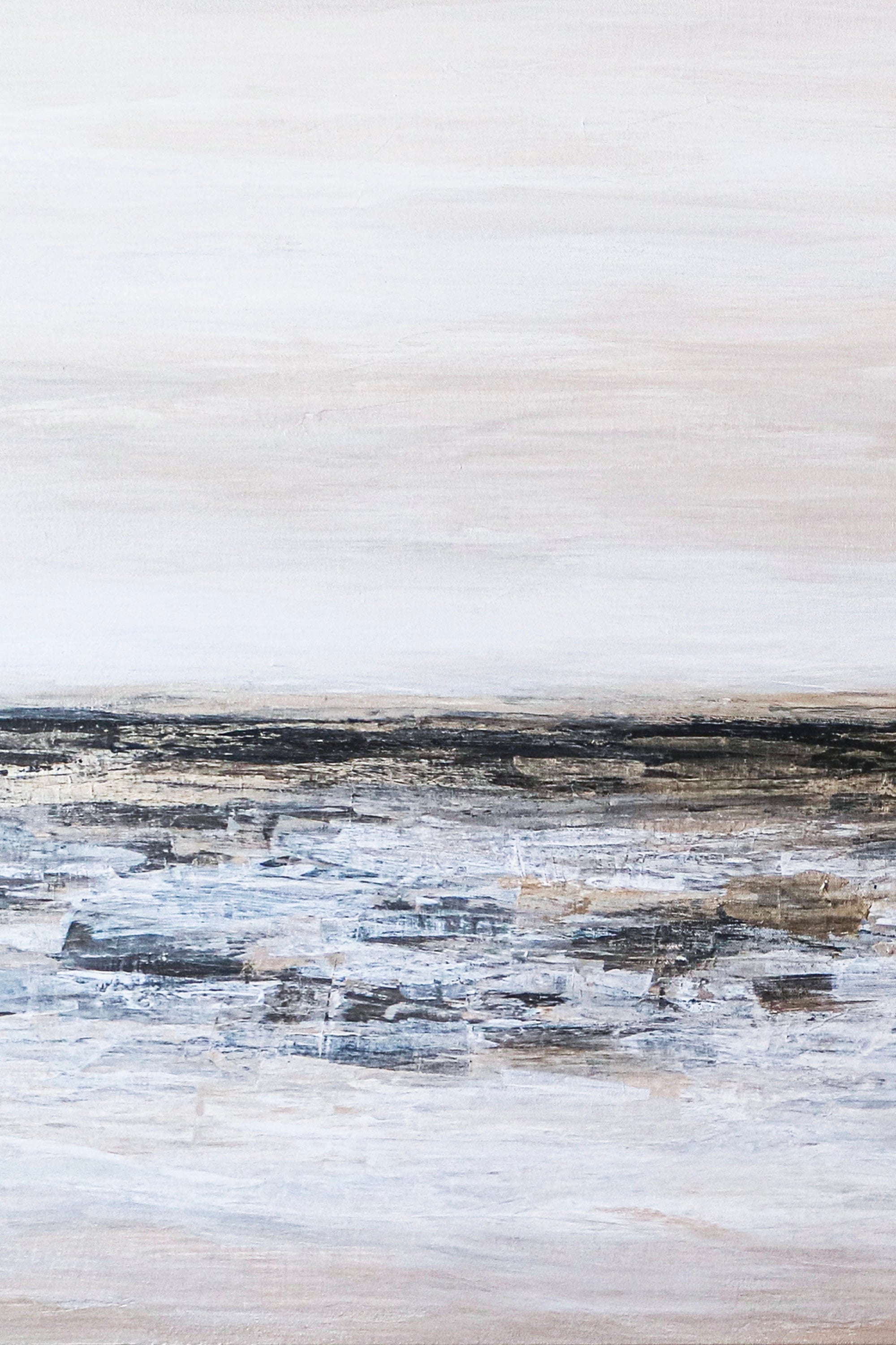 This abstract painting is an original painting and original art piece created with oil painting and acrylic painting on canvas. Horizon II captures the quiet boundary between light and land through a serene, contemporary abstract composition. Its wide, panoramic structure emphasizes openness and stillness, echoing the calm presence of a silent seascape.