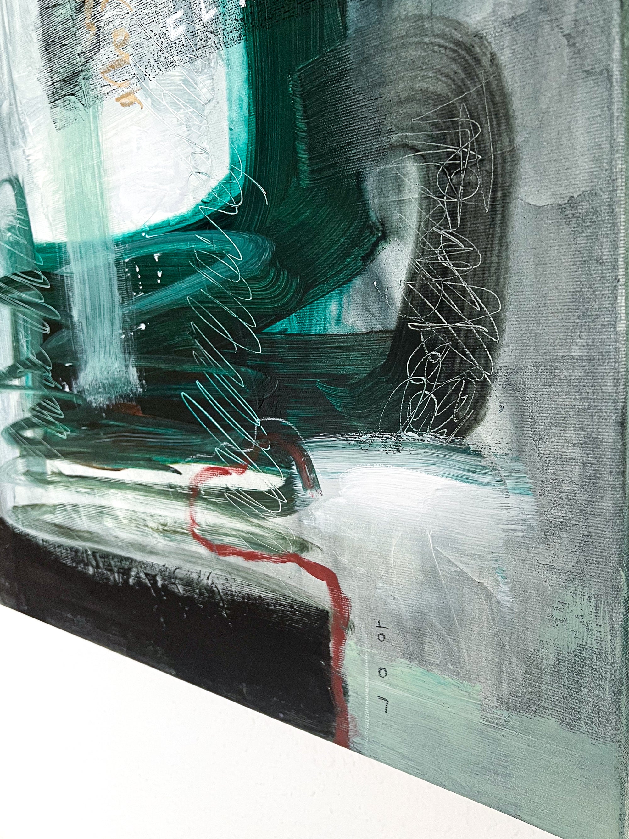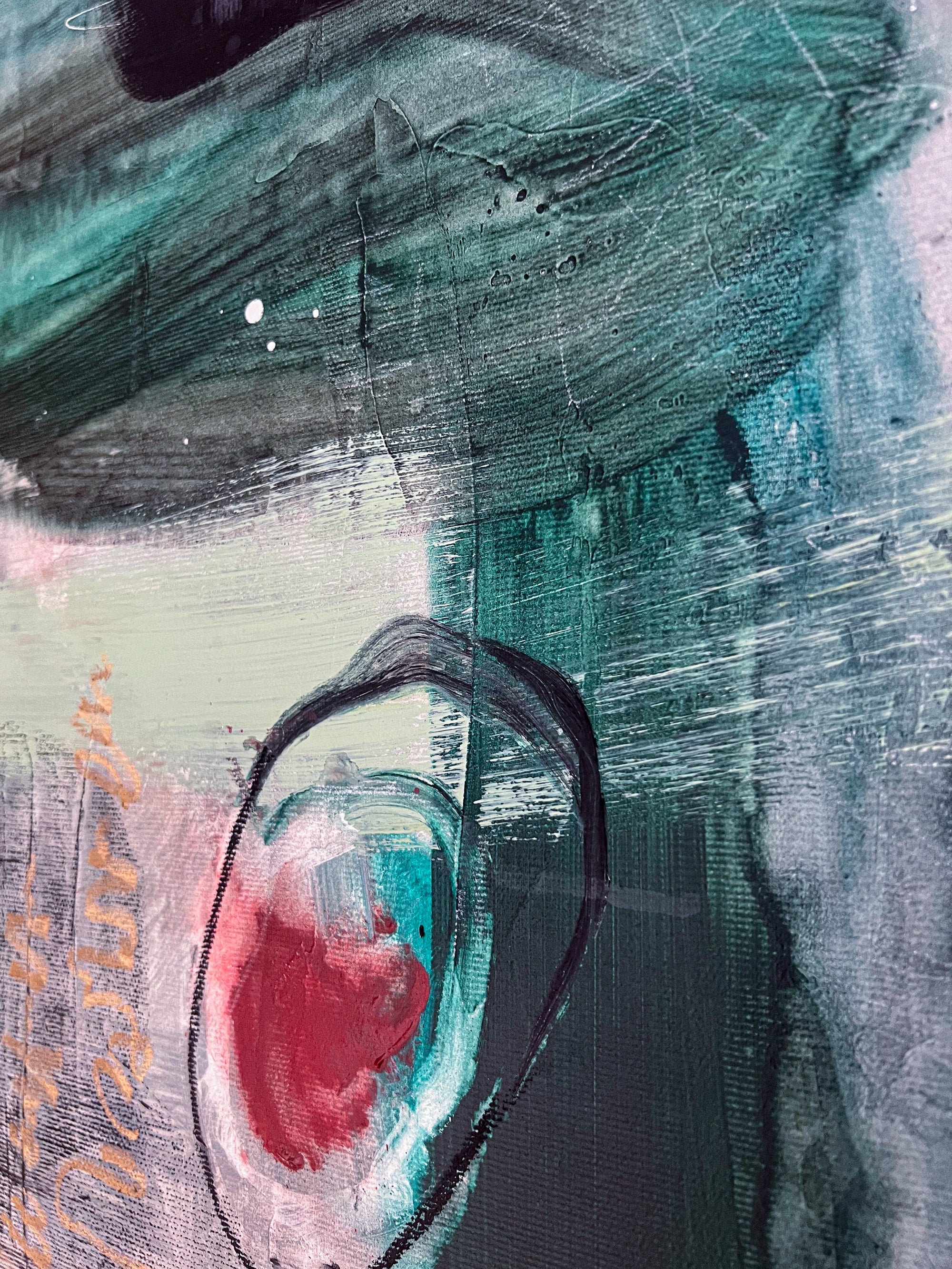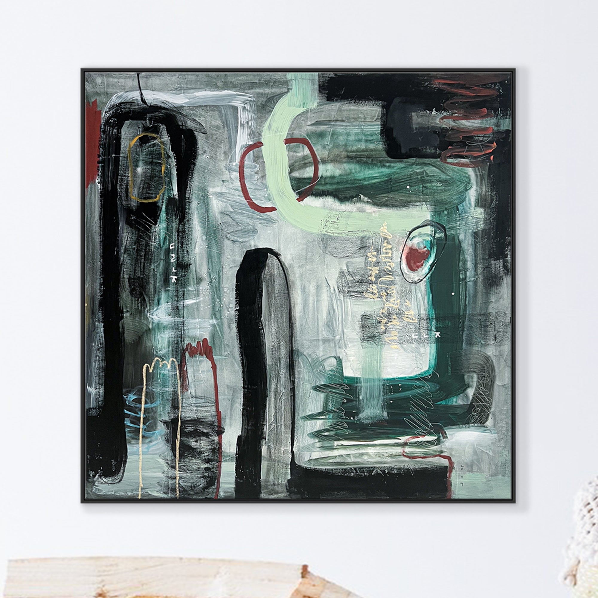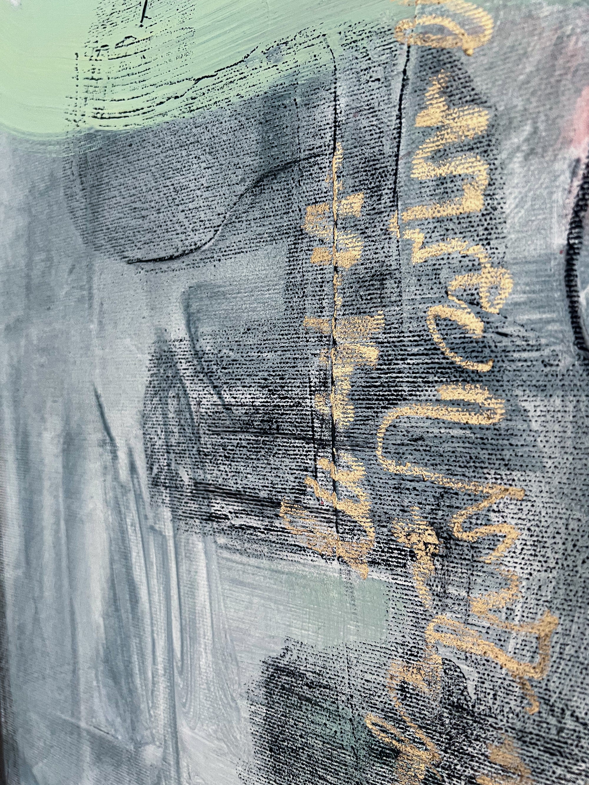 This abstract painting on canvas (40"x40" / 101x101cm) is a large modern wall art piece created with oil, acrylic, pencil, and oil pastel. It explores the fusion of sight and sound as a visual language, dissolving boundaries between what is seen and what is heard. The work reflects intuitive symbols, inner listening, and emotional resonance through layered composition and texture.