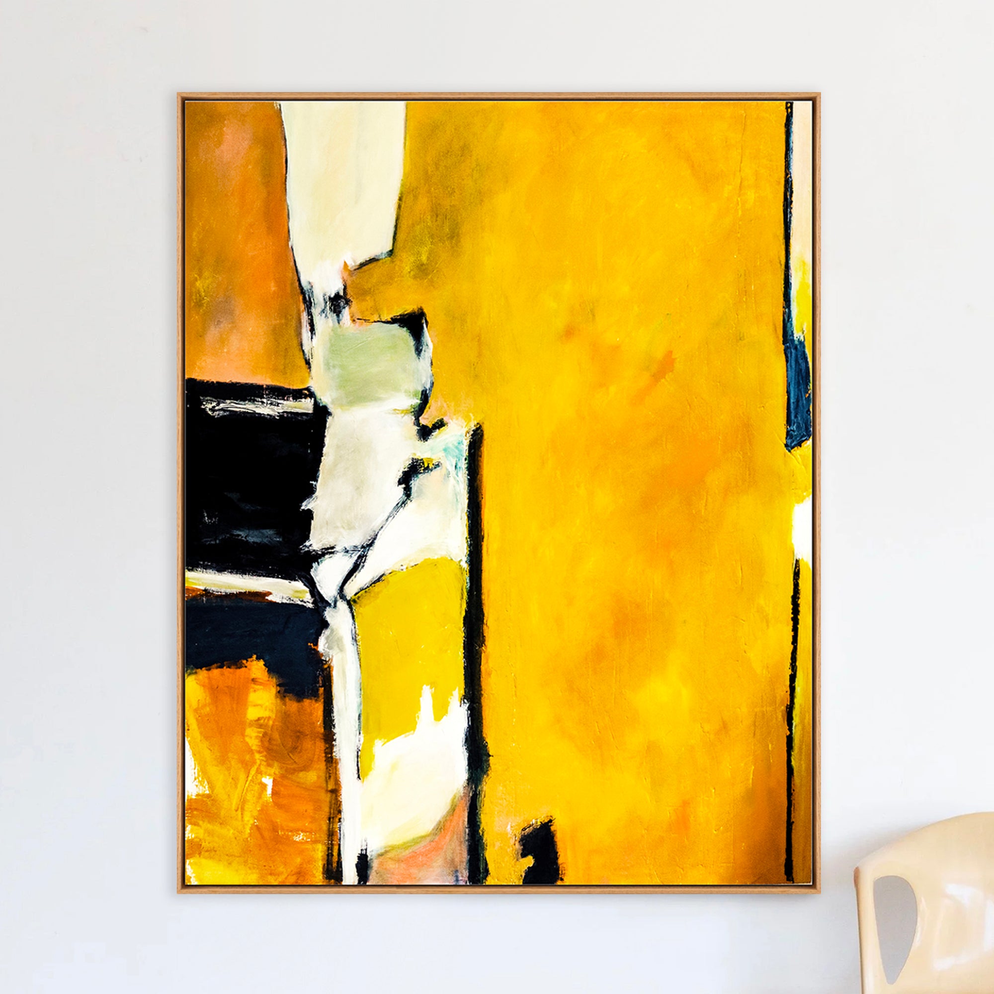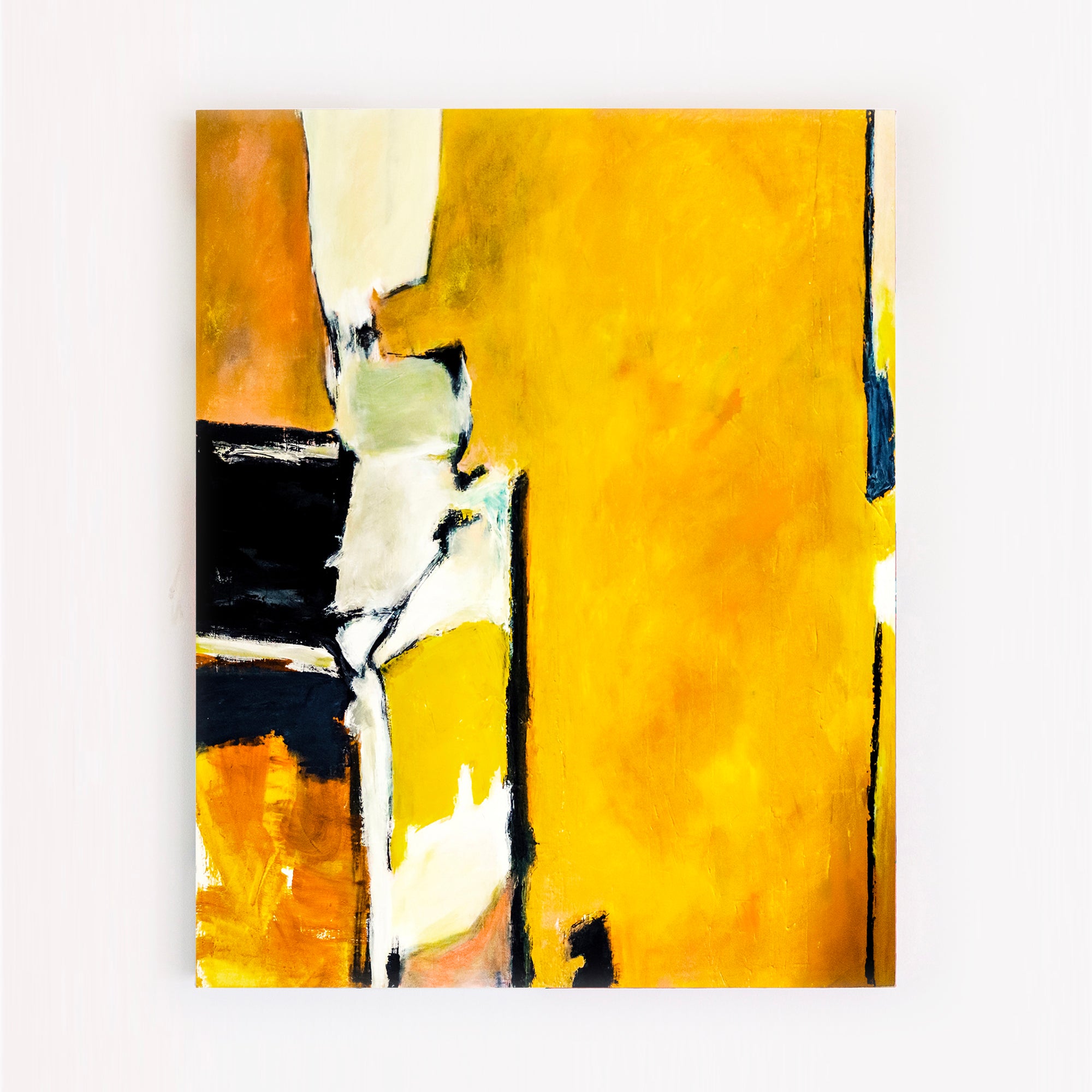 This abstract painting is an original painting and original art piece created with oil painting and acrylic painting on canvas. As It Stands explores the quiet tension of waiting through a vibrant and expressive abstract composition. Built around luminous yellow, the palette expands with orange, light olive, pink, beige, black, and white, creating a rhythmic interplay of warmth and contrast.